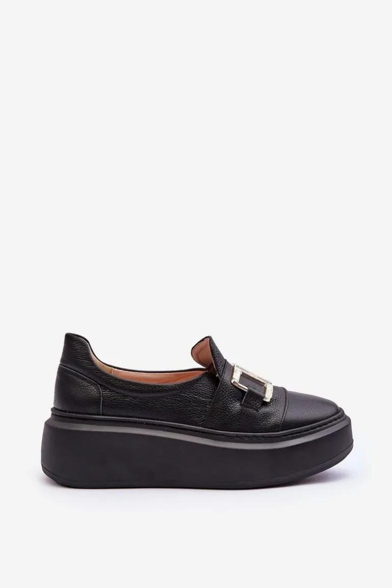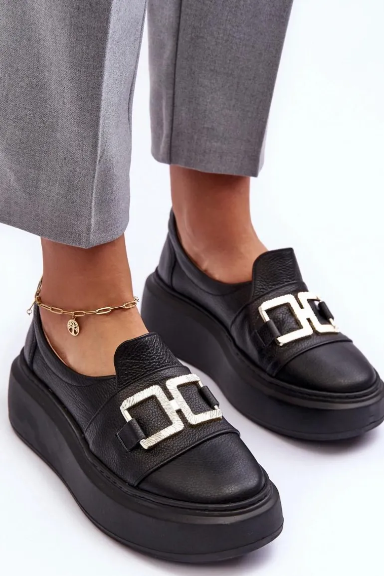Damskie, wsuwane półbuty zostały wykonane z naturalnej skóry. Z przodu złota ozdoba z tworzywa sztucznego. Model ten osadzony jest na masywnej platformie. Pod językiem znajduje się elastyczna gumka, która pozwoli na odpowiednie dopasowanie obuwia do tęgości nogi. Noski zaokrąglone. Zapiętek usztywniony. Władka wykonana z naturalnej skóry zadba o komfort użytkowania przez cały dzień! Przy wyborze rozmiaru prosimy sugerować się tabelą rozmiarów.