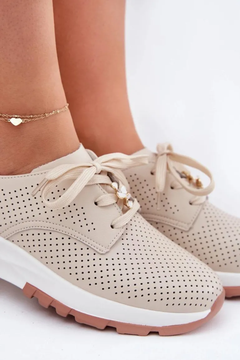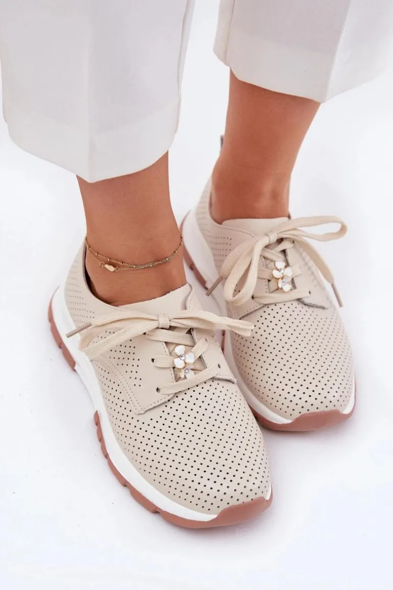 Półbuty damskie w sportowym stylu wykonane z naturalnej skóry to połączenie komfortu i modnego wyglądu. Osadzone na platformie, zapewniają lekkość i wygodę przez cały dzień. Sznurowanie ozdobione przypinką w kształcie kwiatuszków dodaje im urokliwego akcentu, a zaokrąglone noski gwarantują pełną swobodę ruchu. Skórzana wkładka dba o komfort stóp, czyniąc te półbuty doskonałym wyborem na co dzień. Przy wyborze rozmiaru prosimy sugerować się tabelą rozmiarów.