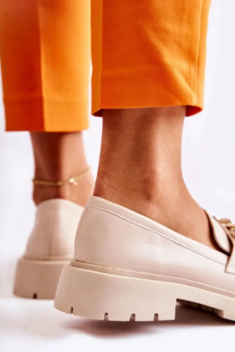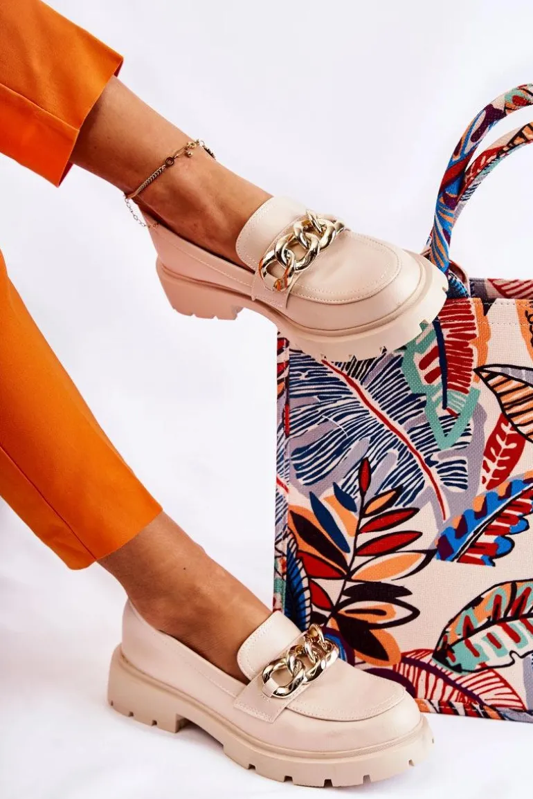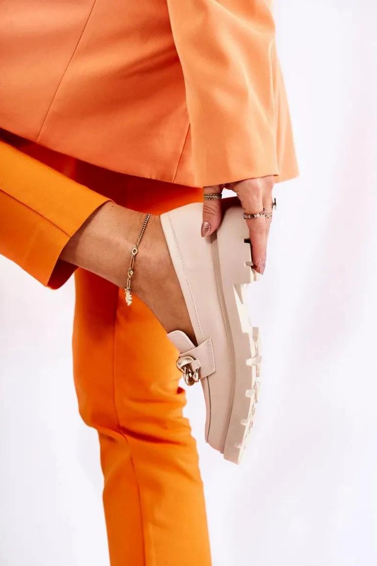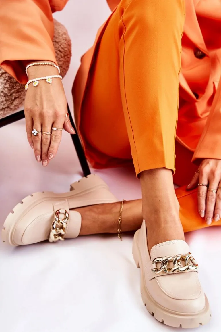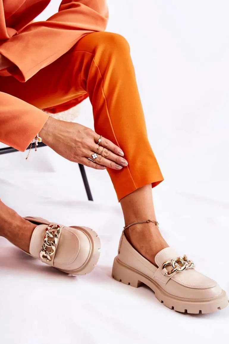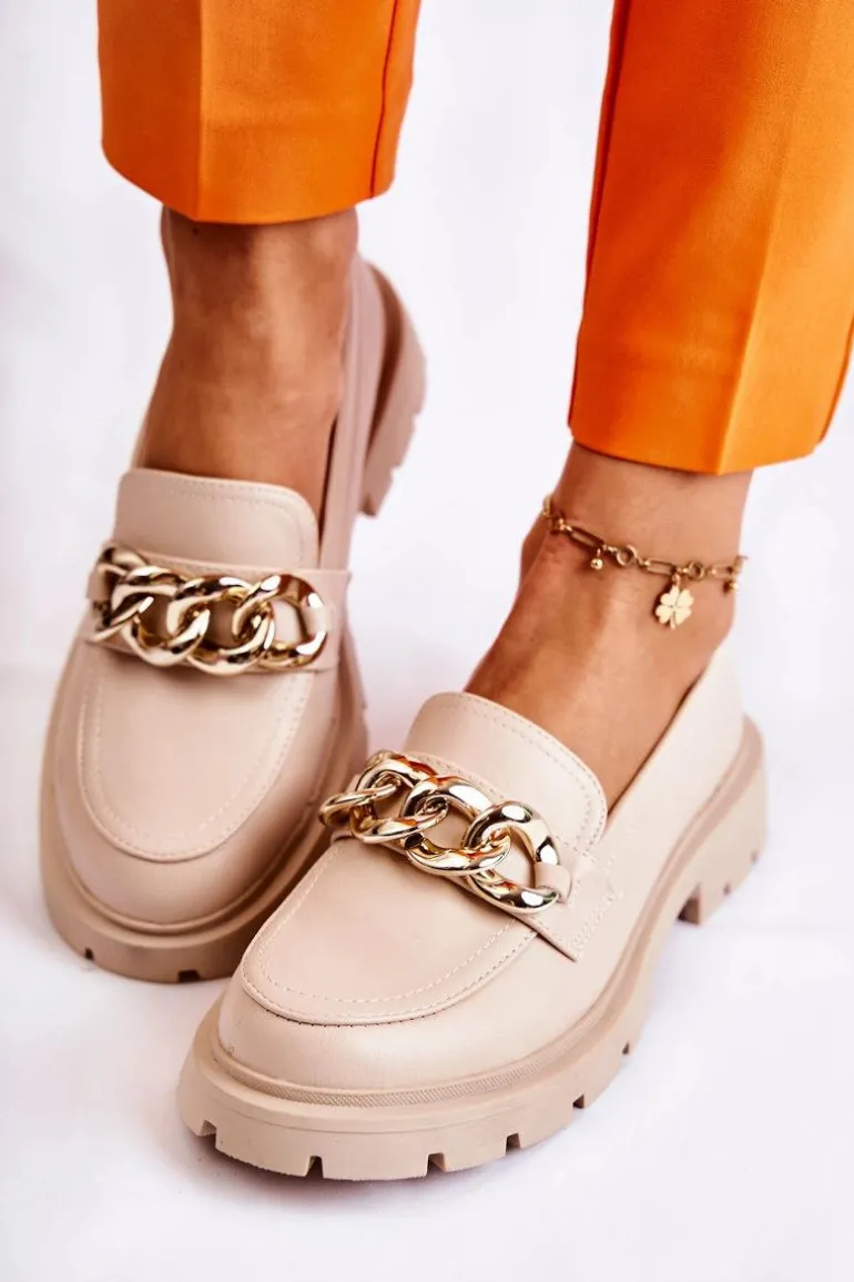Świetne półbuty w stylu przepięknych loaferów. Buty zostały wykonane z wysokiej jakości eko skóry. Charakterystyczny łańcuch wygląda naprawdę cudnie. Półbuty posiadają grubszą podeszwę oraz obcas, który uniesie naszą sylwetkę. Miękka, eko skórzana wkładka zadba o wygodę podczas noszenia. Koniecznie powinnaś je mieć! Przy wyborze rozmiaru prosimy sugerować się tabelą rozmiarów.