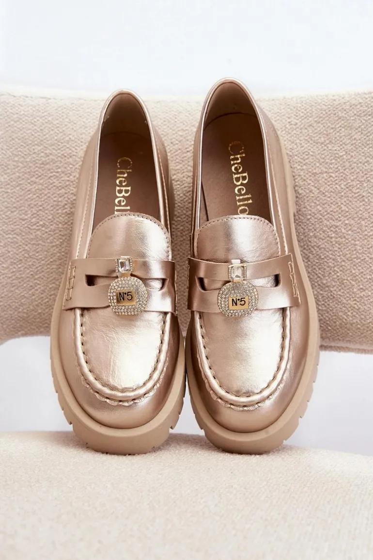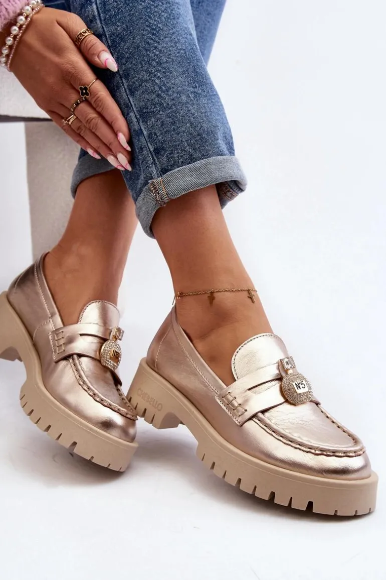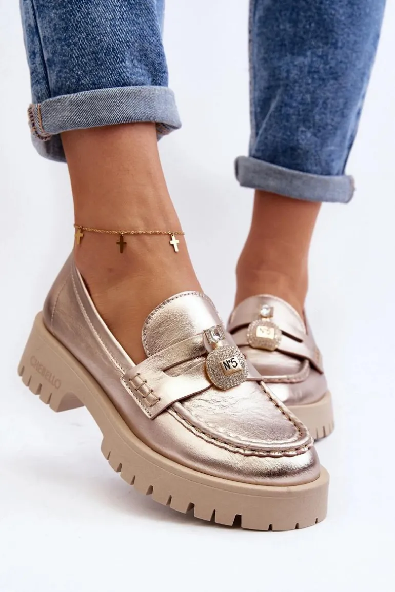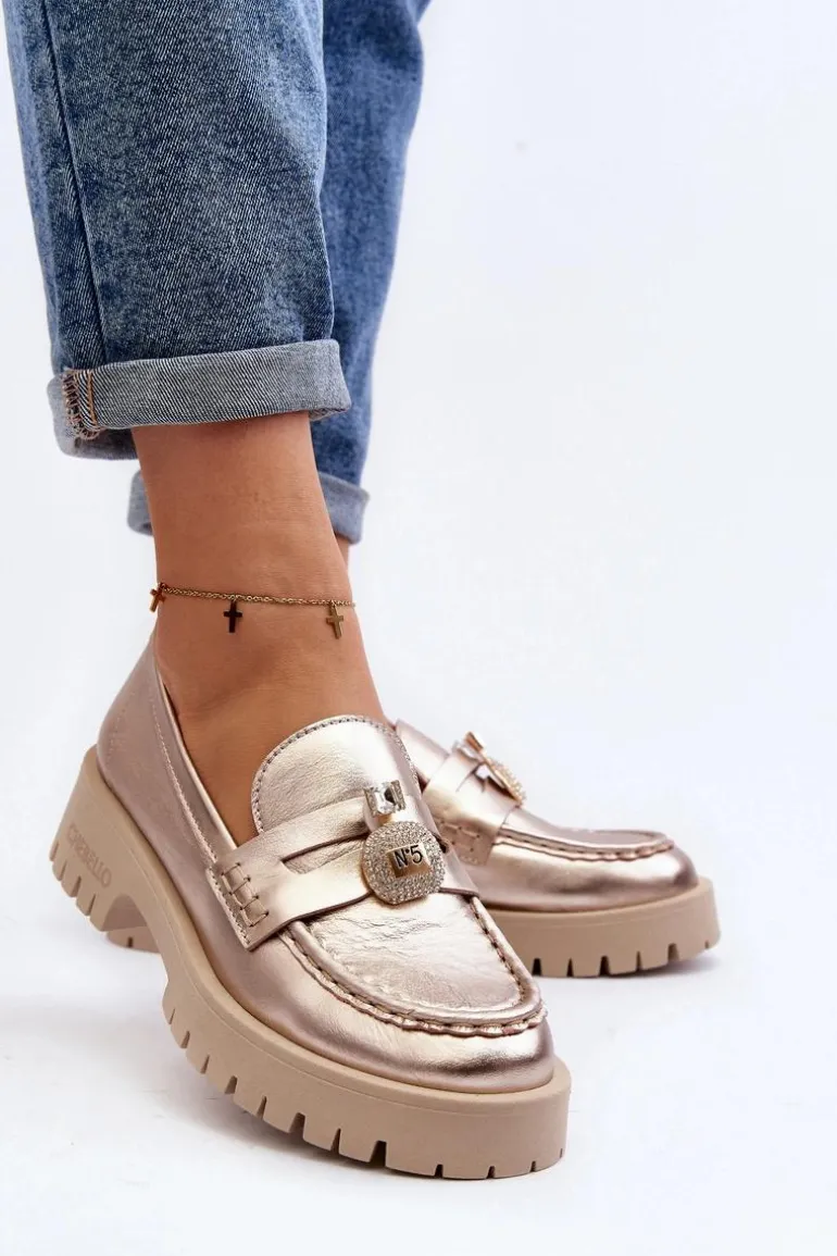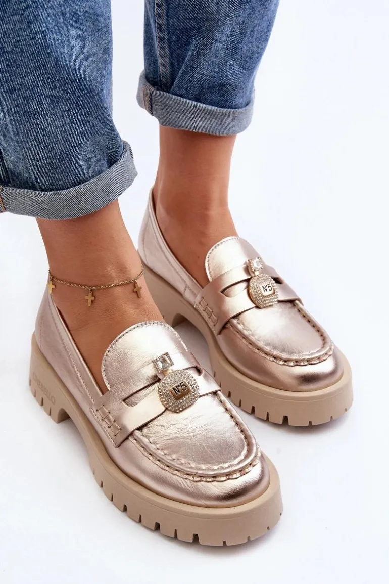 Piękne, damskie mokasyny wykonane ze skóry naturalnej. Osadzone na płaskim, masywnym obcasie. Skórzana wkładka w tych mokasynach jest miękka i wygodna podczas użytkowania. Model ten posiada ozdobę na pasku. Fason ten idealnie sprawdzi się w codziennych stylizacjach! Przy wyborze rozmiaru prosimy sugerować się tabelą rozmiarów.