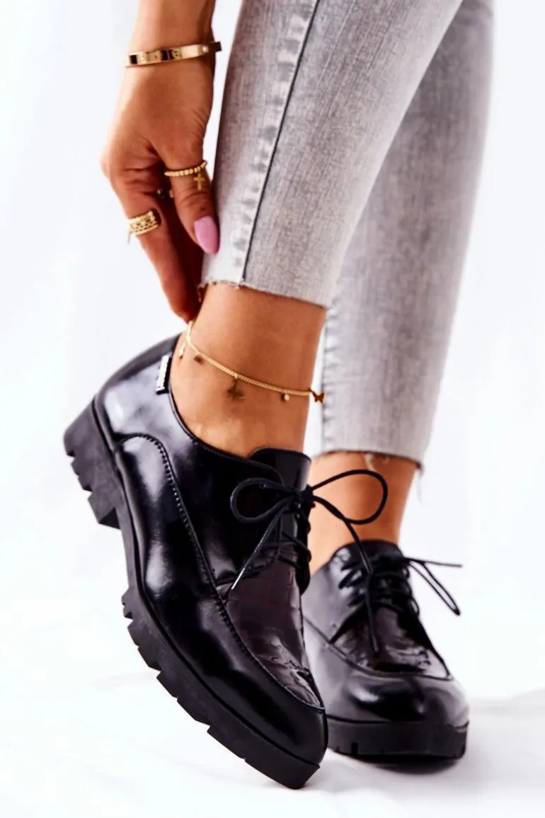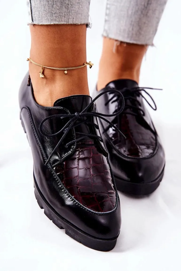 Półbuty zostały wykonane z wysokiej jakości naturalnej skóry, częściowo lakierowanej. Miękka wkładka ze skóry naturalnej to gwarancja komfortu. Wiązanie sprawia, że można dopasować je odpowiednio do tęgości nogi. Niewysoki, masywny obcas zapewnia wygodę. Nosek w szpic sprawi, że noga będzie wyglądać smuklej. Podczas wyboru rozmiaru prosimy sugerować się tabelą rozmiarów.