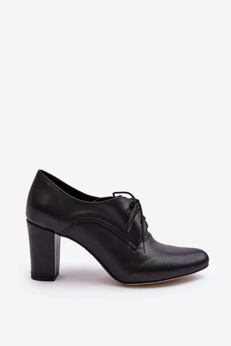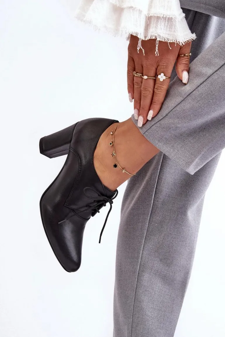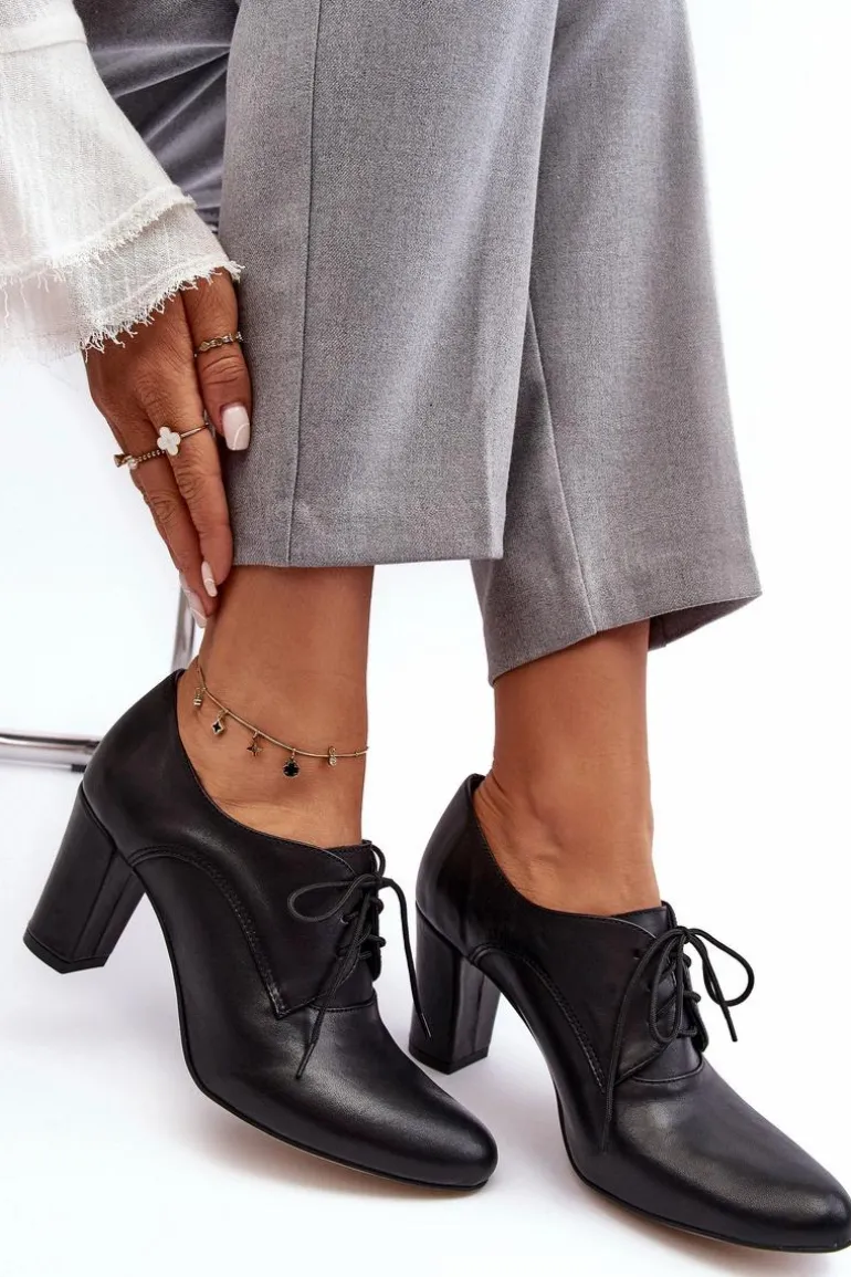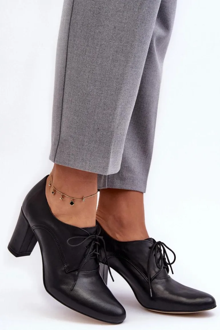 Damskie półbuty na obcasie w postaci słupka posiadają cholewkę wykonaną ze skóry naturalnej. Półbuty posiadają sznurowanie umożliwiające odpowiednie dopasowanie obuwia. Dodatkowo zapiętek jest usztywniany. Ten model półbutów na obcasie z pewnością wykorzystasz w wielu stylizacjach. Przy wyborze rozmiaru prosimy sugerować się tabelą rozmiarów.
