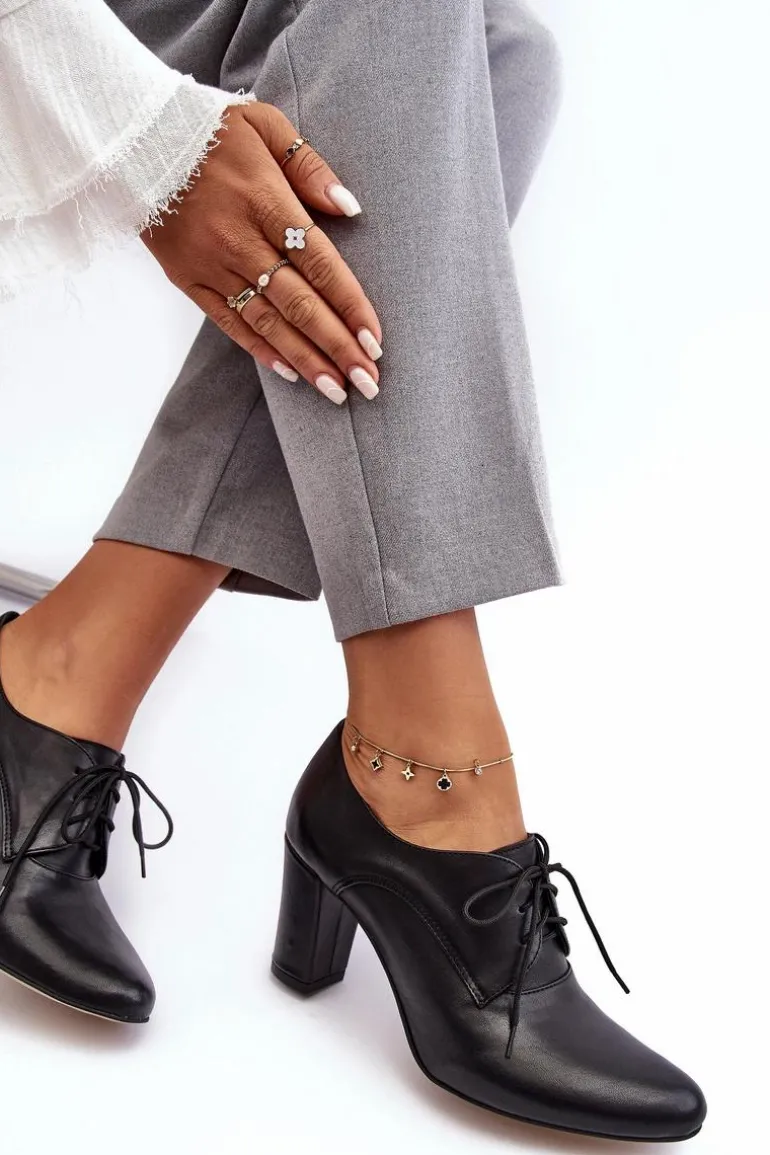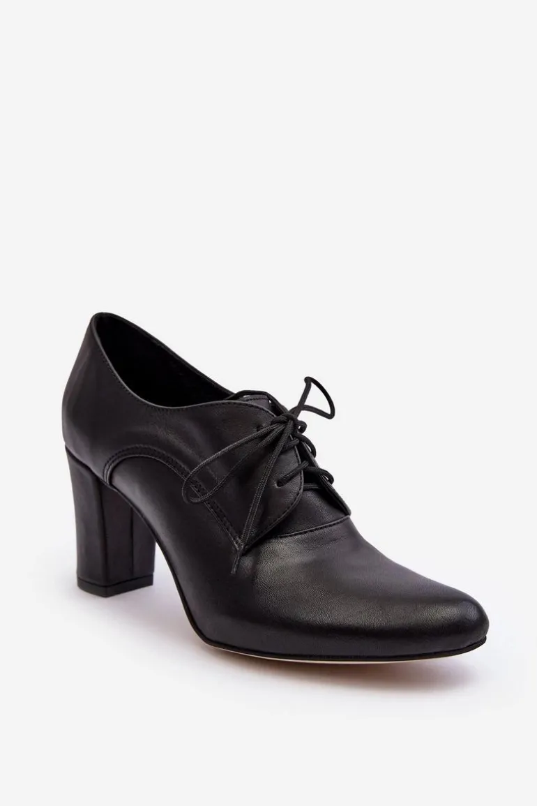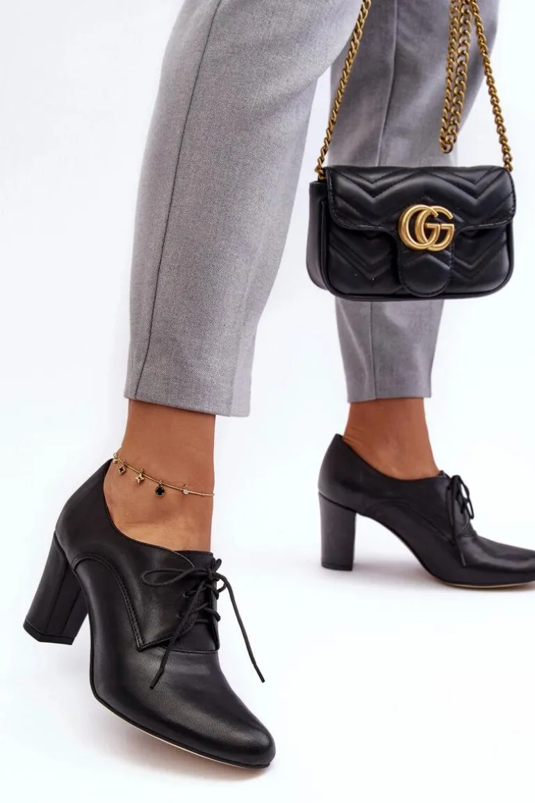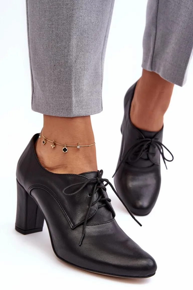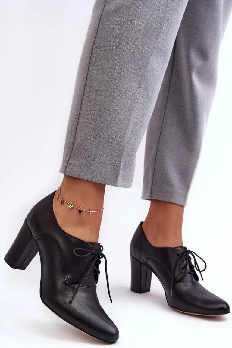 Damskie półbuty na obcasie w postaci słupka posiadają cholewkę wykonaną ze skóry naturalnej. Półbuty posiadają sznurowanie umożliwiające odpowiednie dopasowanie obuwia. Dodatkowo zapiętek jest usztywniany. Ten model półbutów na obcasie z pewnością wykorzystasz w wielu stylizacjach. Przy wyborze rozmiaru prosimy sugerować się tabelą rozmiarów.