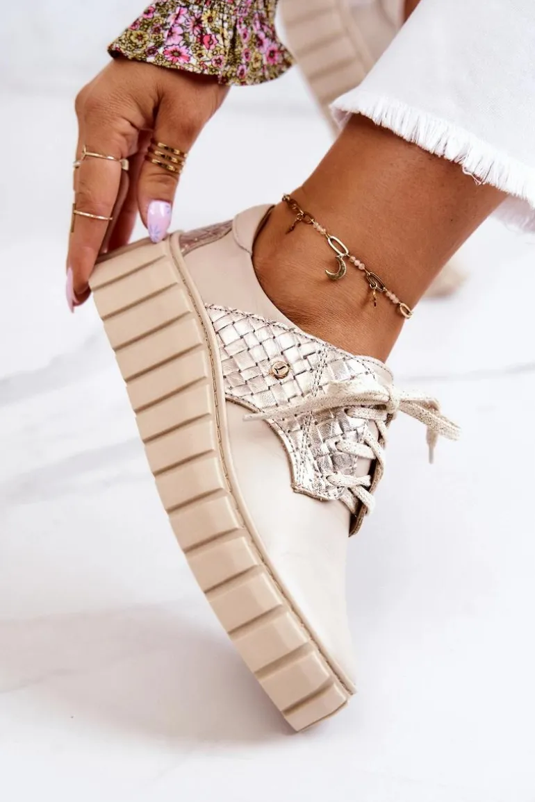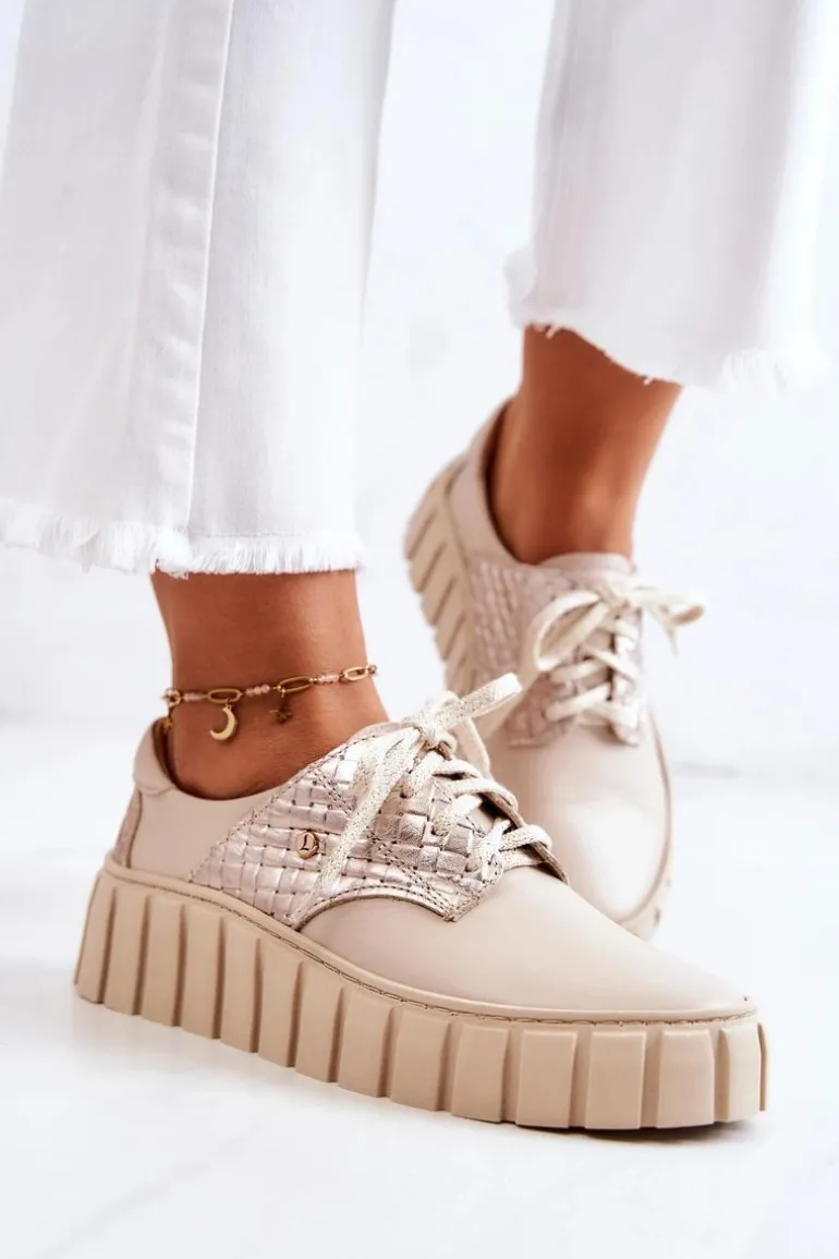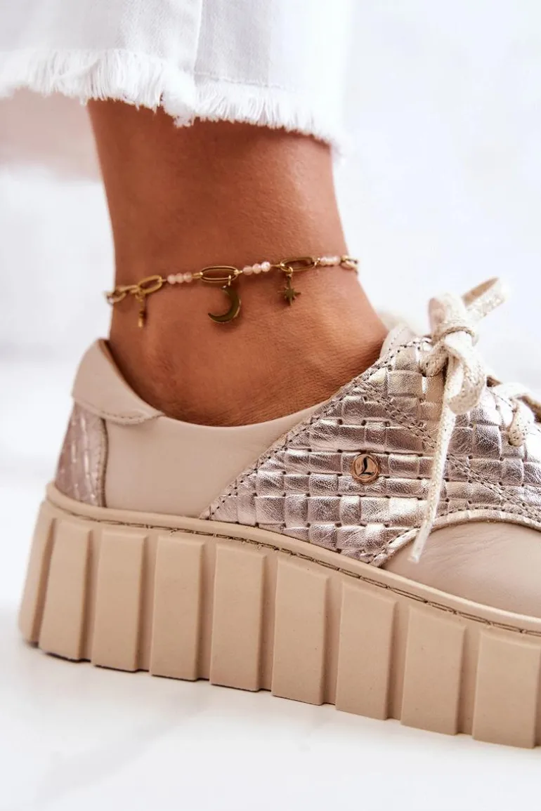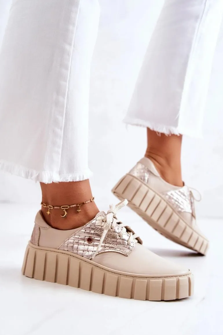 Półbuty posiadają wiązanie na płaskie, ozdobione błyszczącą nicią sznurowadła. Osadzone na masywnej platformie ze żłobieniami po bokach. Wewnątrz wygodna wkładka z naturalnej skóry, która jest dodatkowo profilowana. Cholewka przed kostkę została wykonana z naturalnej skóry z efektem metalicznym. Bardzo lekkie i komfortowe w użytkowaniu. Idealne do eleganckich spodni, tiulowych spódnic czy dzianinowych sukienek. Możesz je łączyć z różnymi stylizacjami – zawsze będą wyglądać świetnie! Te cudne buty zdecydowanie muszą znaleźć się w Twojej garderobie!Przy wyborze rozmiaru prosimy sugerować się tabelą rozmiarów.