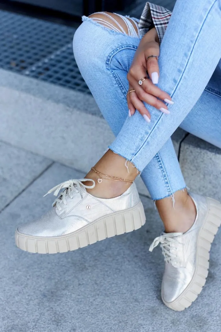 Półbuty posiadają wiązanie na płaskie, ozdobione błyszczącą nicią sznurowadła. Osadzone na masywnej platformie z żłobieniami po bokach. Wewnątrz wygodna wkładka z naturalnej skóry, która jest dodatkowo profilowana. Cholewka przed kostkę została wykonana z naturalnej skóry z efektem metalicznym. Bardzo lekkie i komfortowe w użytkowaniu. Idealne do eleganckich spodni, tiulowych spódnic czy dzianinowych sukienek. Możesz je łączyć z różnymi stylizacjami – zawsze będą wyglądać świetnie! Te cudne buty zdecydowanie muszą znaleźć się w Twojej garderobie!Przy wyborze rozmiaru prosimy sugerować się tabelą rozmiarów.