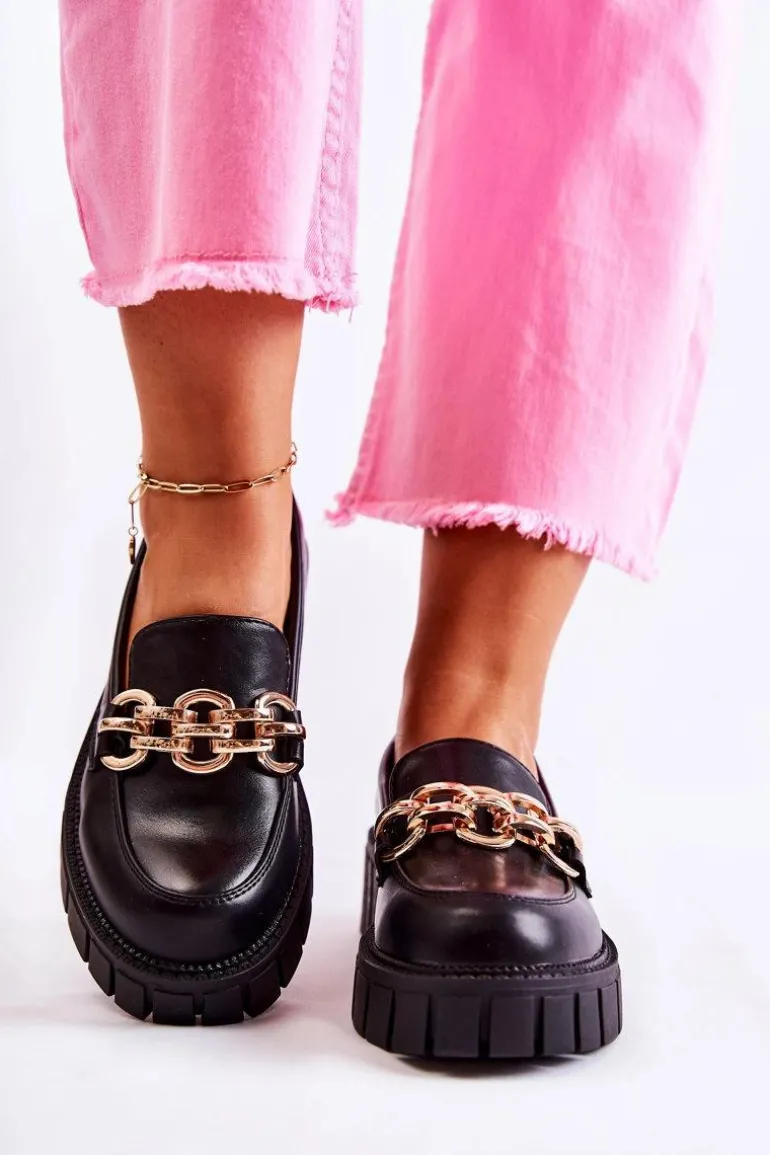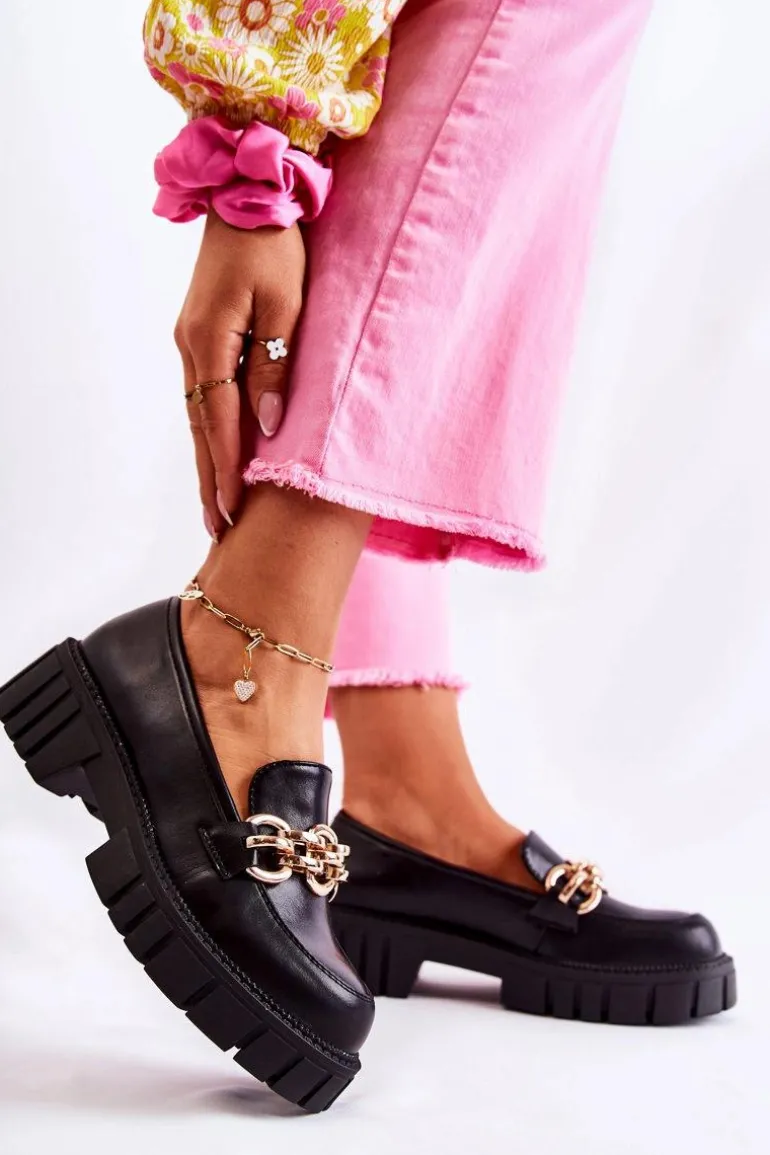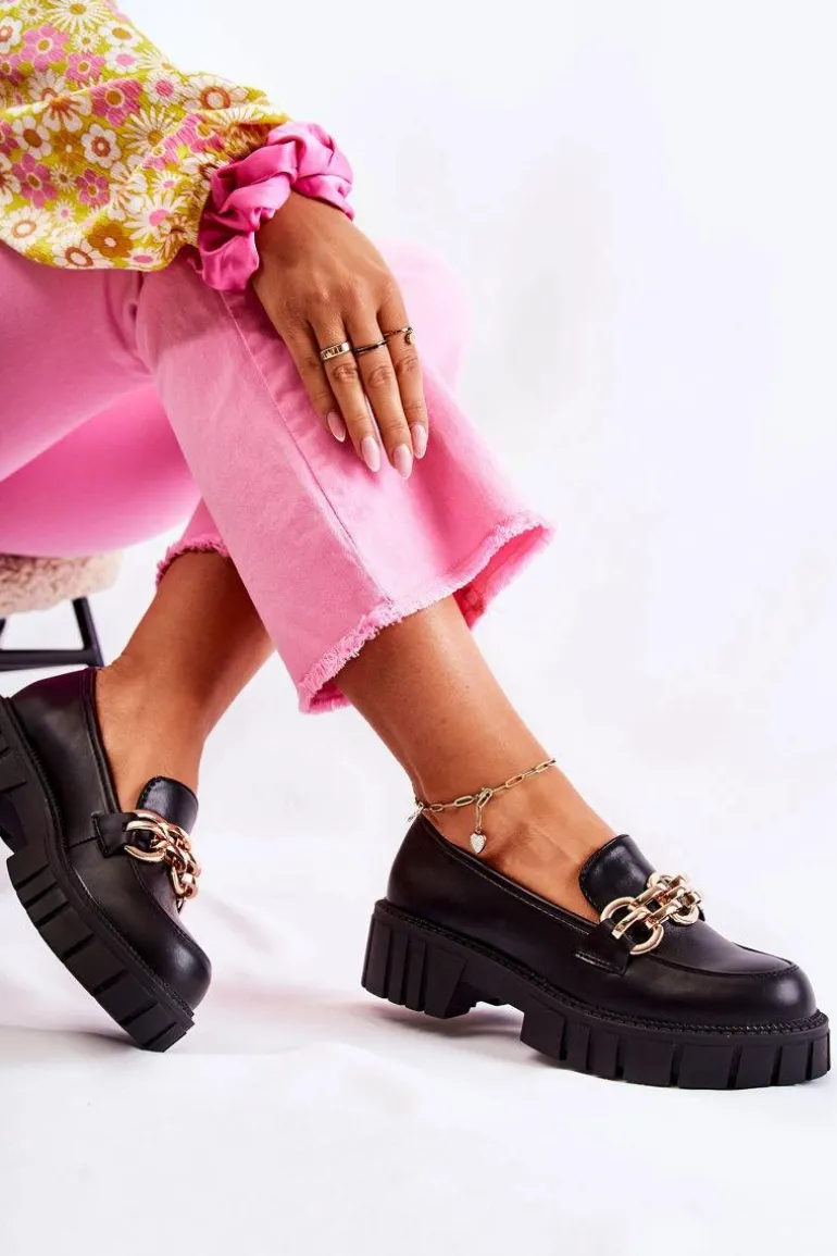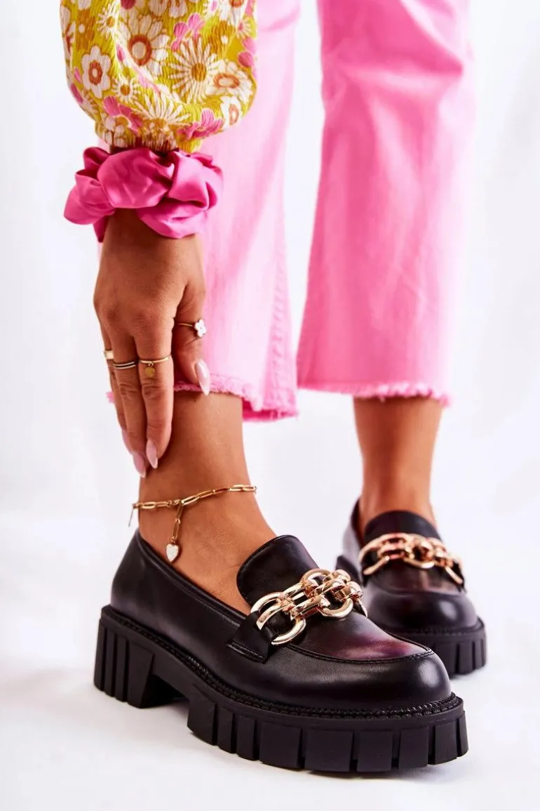 Modne półbuty zostały wykonane z wysokiej jakości eko skóry. Ozdobny łańcuch na przodzie został wykonany z tworzywa sztucznego – dodaje butom elegancji. Półbuty posiadają usztywniany zapiętek. Model wsuwany. Osadzone na masywnej platformie i płaskim obcasie ze żłobieniami po bokach. Miękka wkładka wykonana z eko skóry zapewni wygodę podczas całodziennego użytkowania. Ten model to HIT sezonu! Koniecznie powinnaś je mieć w swojej garderobie! Przy wyborze rozmiaru prosimy sugerować się tabelą rozmiarów.