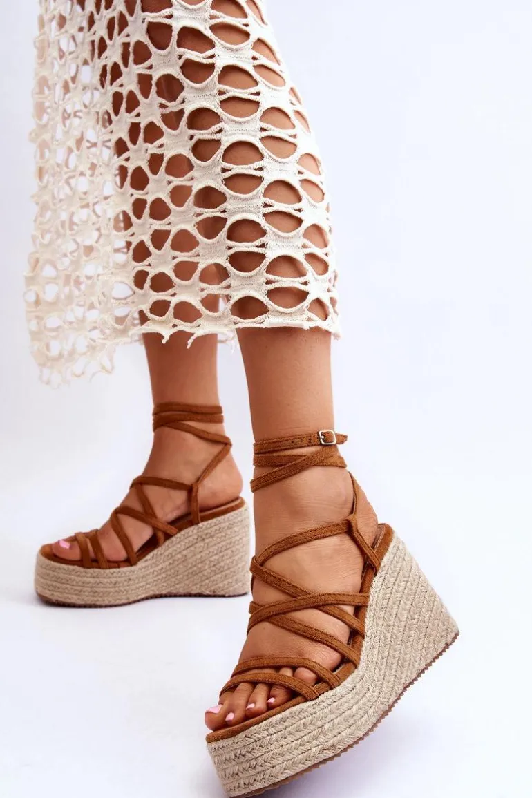 Skórzane Sandałki Na Koturnie Brązowe Margaritt