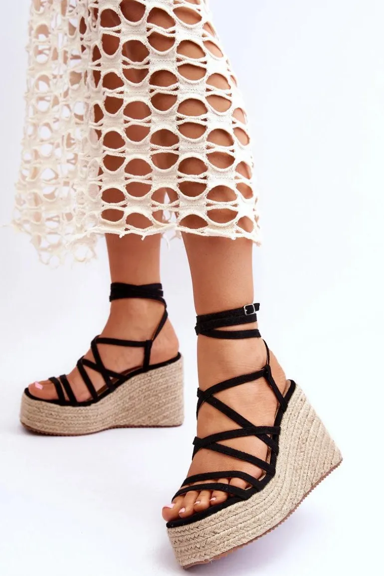 Idealne sandały na lato! Posiadają wysoki koturn oraz platformę ozdobione jutową plecionką. Posiadają odkryty, kwadratowy nosek. Sandałki są zapinane na długi, regulowany pasek ze sprzączką. Niezwykle miękka, wykonana z eko skóry wkładka jest bardzo wygodna w użytkowaniu nawet przez cały dzień. Te buty będą znakomitym dodatkiem do zwiewnej sukienki czy spódniczki. Przy wyborze rozmiaru prosimy kierować tabelą rozmiarów.