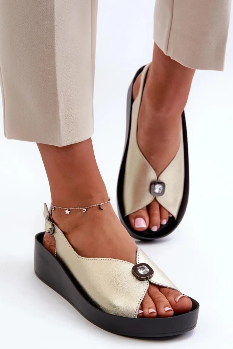 Eleganckie sandały damskie marki S.Barski. Osadzone na platformie i koturnie. Z przodu znajduje się subtelna ozdoba, która dodaje elegancji. Zapinane na regulowany pasek ze sprzączką, zapewniają doskonałe dopasowanie i komfort noszenia przez cały dzień. Stylowe i wygodne obuwie na każdą okazję. Przy wyborze rozmiaru prosimy kierować się tabelą rozmiarów.