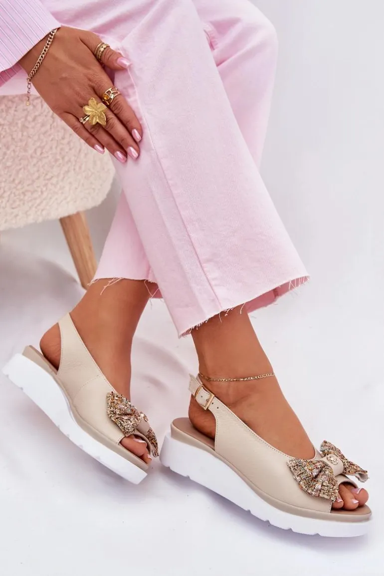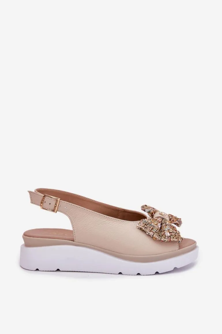 Sandały damskie z naturalnej skóry, osadzone na koturnie, to elegancka i wygodna opcja na letnie dni. Zapinane na klamrę z regulowanym paskiem, zapewniają doskonałe dopasowanie do stopy. Z przodu znajdują się urocza kokardka ze złotym detalem, która dodaje im subtelnego uroku. Doskonałe do sukienek, spódnic czy spodni, łączą komfort z modnym wyglądem. Idealne na codzienne wyjścia oraz specjalne okazje. Przy wyborze rozmiaru prosimy kierować się tabelą rozmiarów.