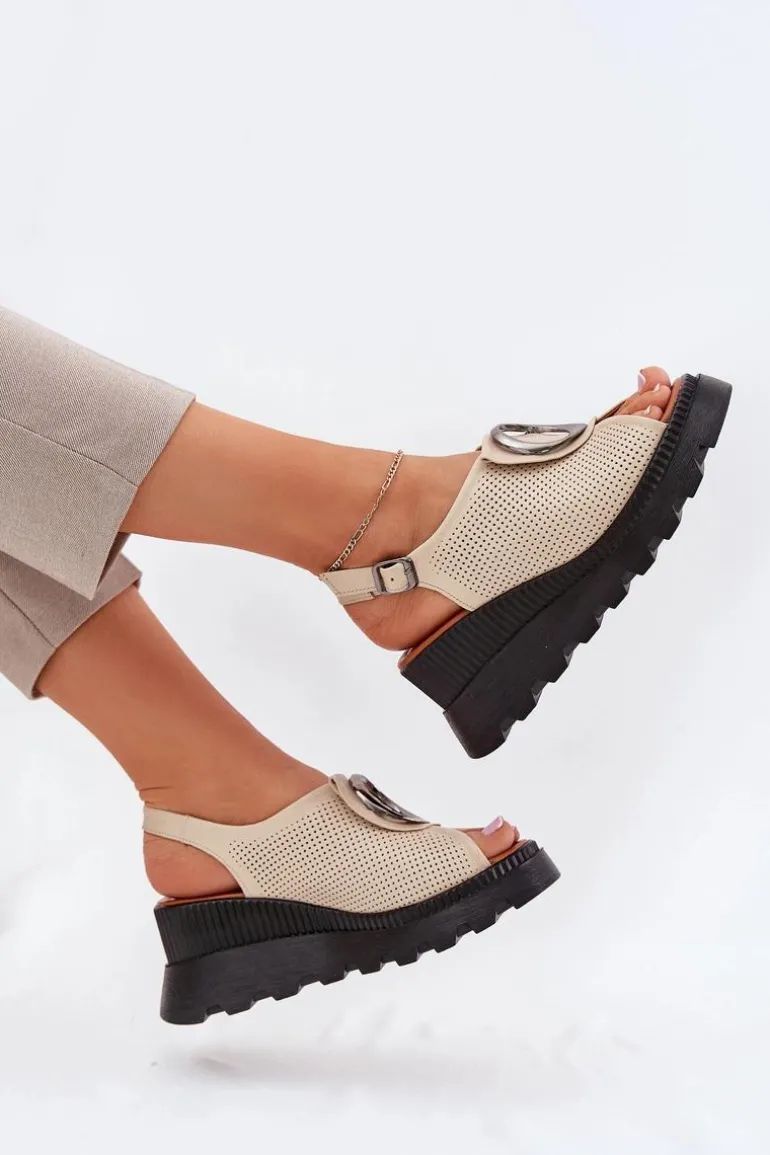 Skórzane Sandały Damskie Na Koturnie Z Ozdobą Artiker 56C0111 Beżowe