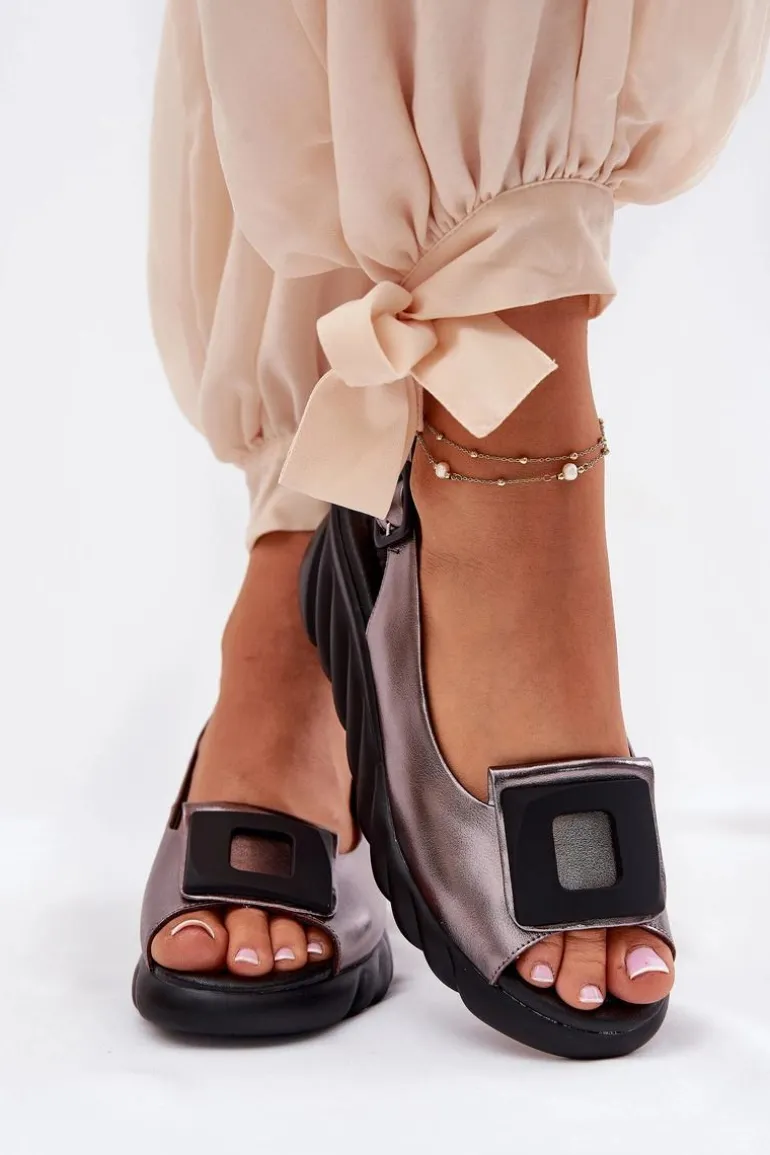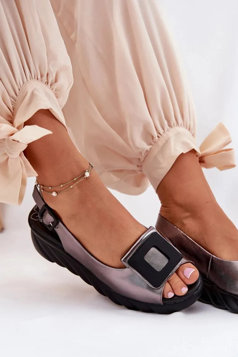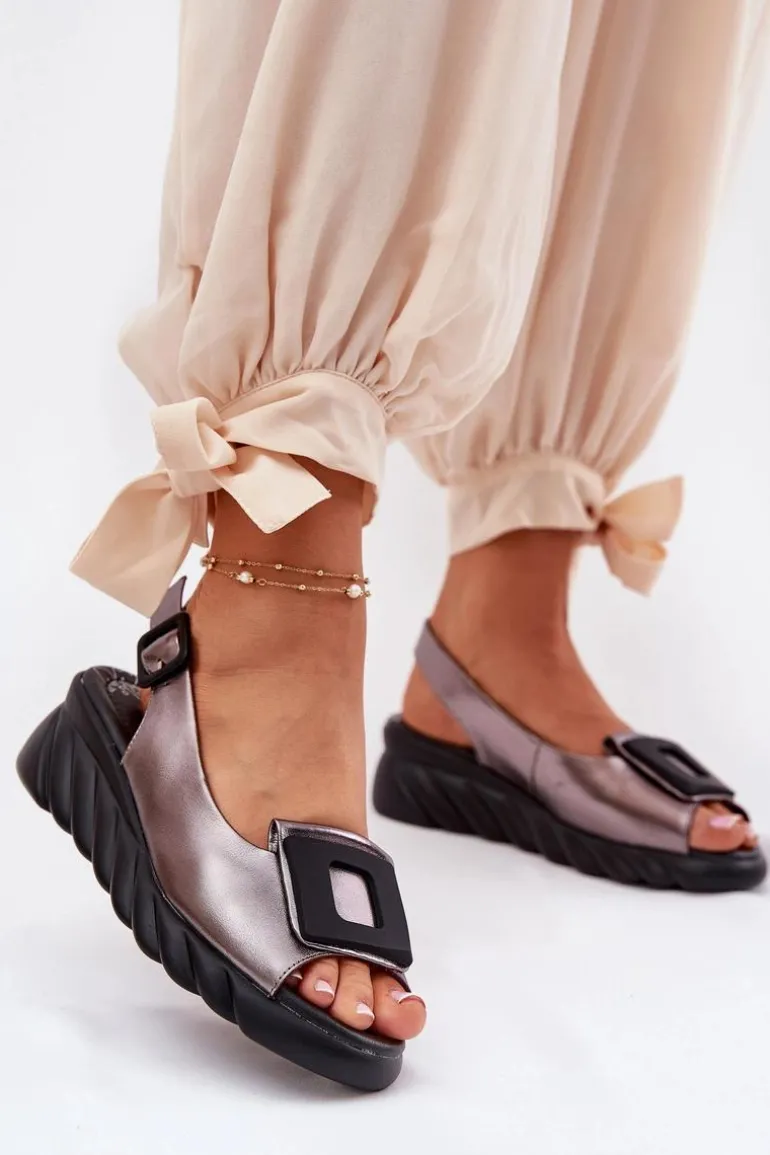 Skórzane Sandały Damskie Na Koturnie z Ozdobą Artiker 56C2158 Grafitowe