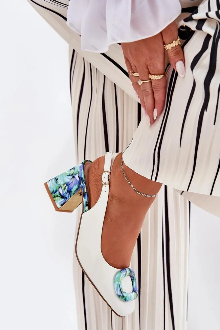 Eleganckie sandały damskie wykonane z naturalnej skóry to połączenie styli i komfortu w jednym. Noski są zakryte, co nadaje im klasycznego charakteru, a ozdobny detal umieszczony z przodu dodatkowo podkreśla ich unikalny charakter. Obcas, zdobiony ciekawym wzorem, doskonale komponuje się z całością, zapewniając stabilność i komfort. Sandały zapinane są na regulowany pasek ze sprzączką, co pozwala na idealne dopasowanie do stopy, a skórzana, miękka wkładka gwarantuje wygodę noszenia przez cały dzień. Idealne na różnorodne okazje. Przy wyborze rozmiaru prosimy sugerować się poniższą tabelą rozmiarów.