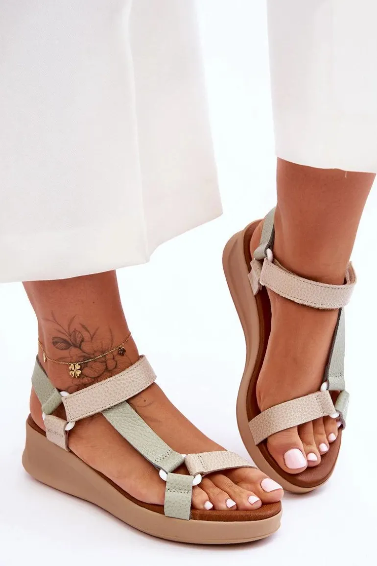 Skórzane Sandały Maciejka L5186-09 Zielono-Beżowe