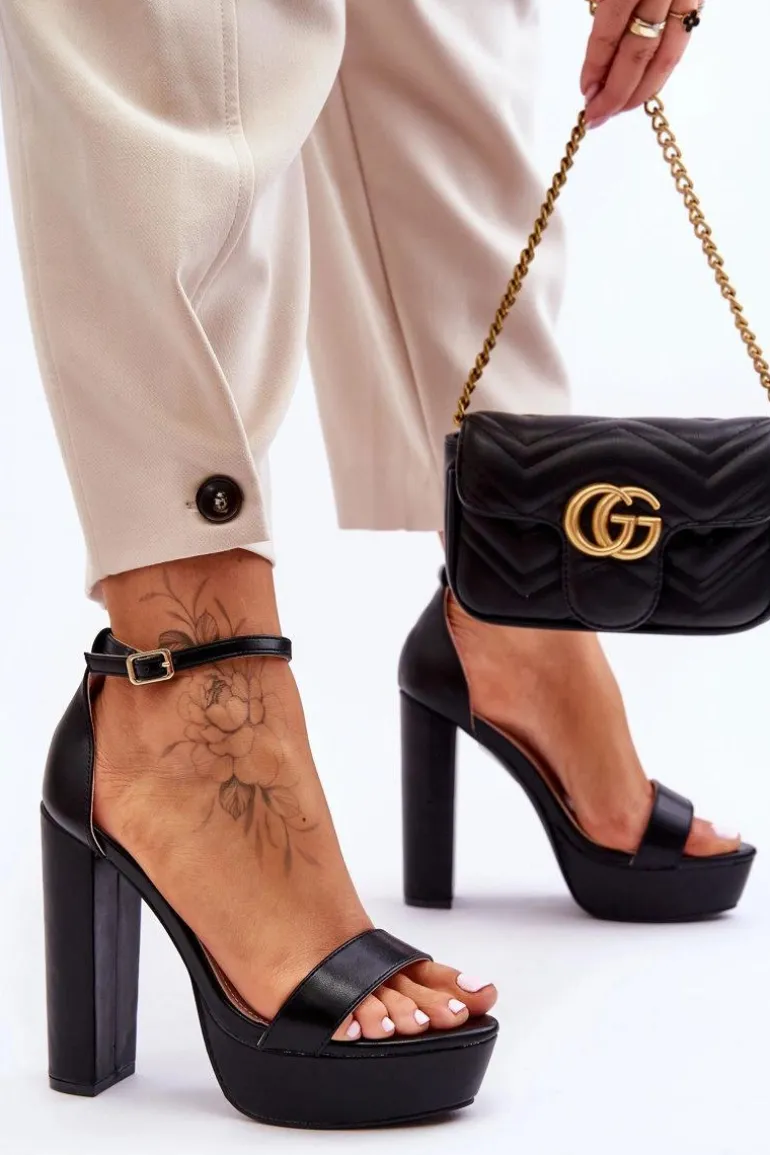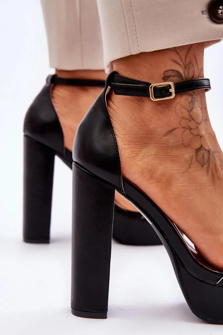 Damskie sandałki zostały wykonane z eko skóry. Model ten posiada na przodzie pasek przytrzymujący stopę przed przesuwaniem. Sandałki osadzono na obcasie w postaci wysokiego słupka oraz platformie. Dodatkowo sandałki posiadają usztywniany zapiętek. Model ten jest zapinany na regulowany pasek ze sprzączką. Przy wyborze rozmiaru prosimy sugerować się tabelą rozmiarów.