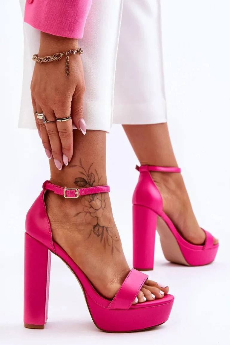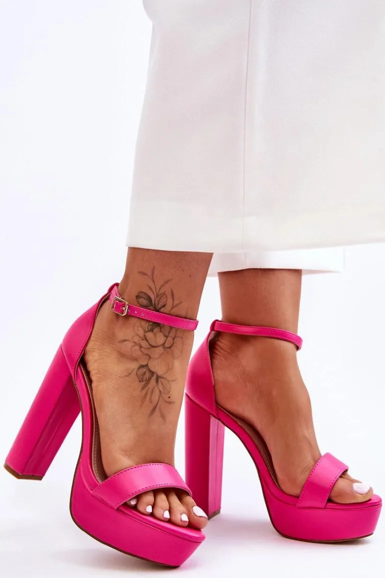 Damskie sandałki zostały wykonane z eko skóry. Model ten posiada na przodzie pasek przytrzymujący stopę przed przesuwaniem. Sandałki osadzono na obcasie w postaci wysokiego słupka oraz platformie. Dodatkowo sandałki posiadają usztywniany zapiętek. Model ten jest zapinany na regulowany pasek ze sprzączką. Przy wyborze rozmiaru prosimy sugerować się tabelą rozmiarów.
