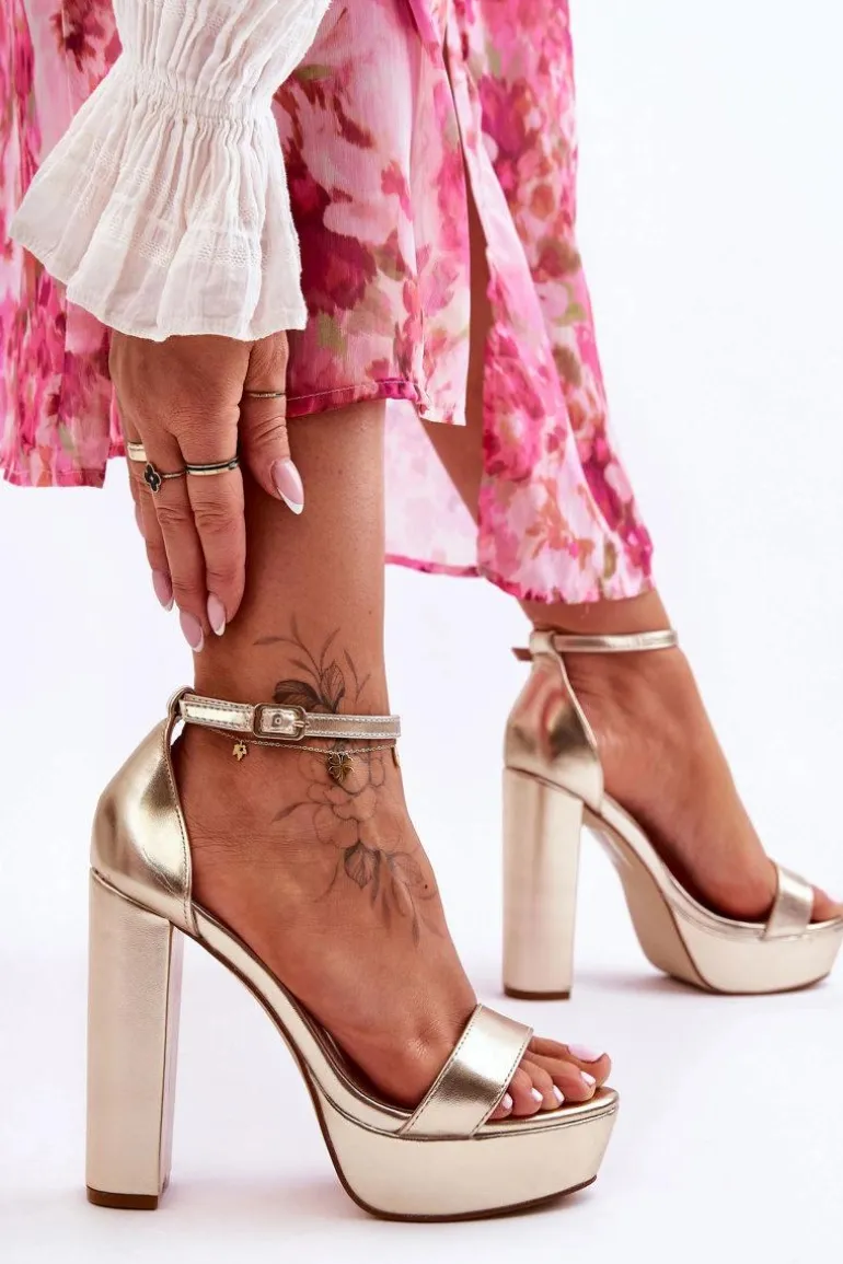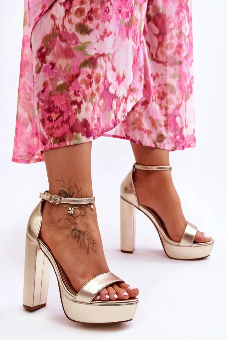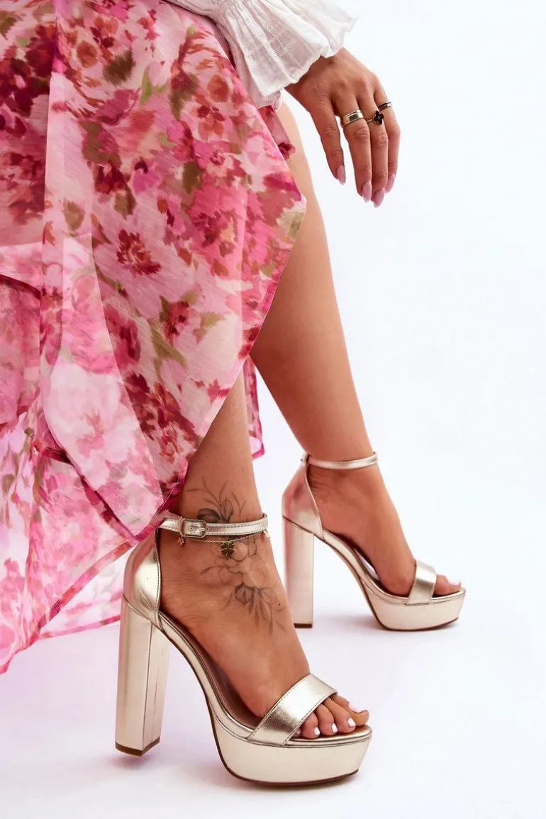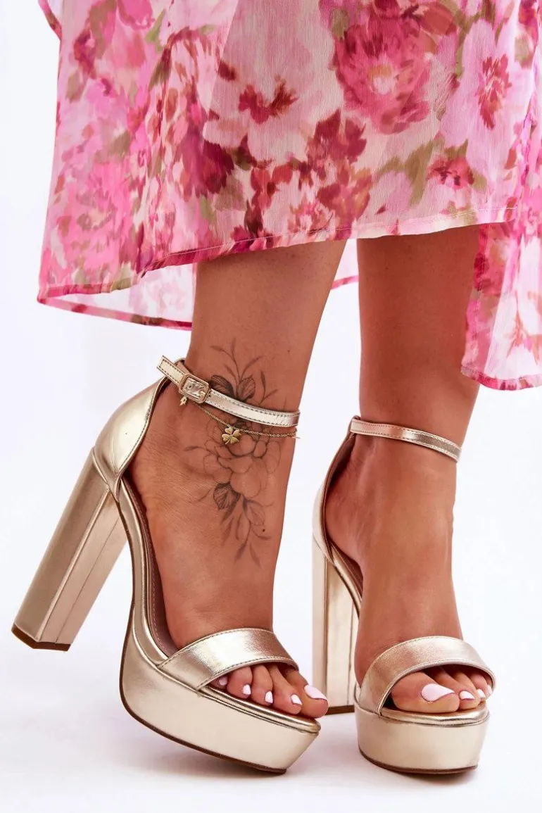 Damskie sandałki zostały wykonane z eko skóry. Model ten posiada na przodzie pasek przytrzymujący stopę przed przesuwaniem. Sandałki osadzono na obcasie w postaci wysokiego słupka oraz platformie. Dodatkowo sandałki posiadają usztywniany zapiętek. Model ten jest zapinany na regulowany pasek ze sprzączką. Przy wyborze rozmiaru prosimy sugerować się tabelą rozmiarów.
