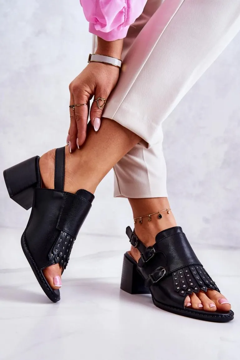 Sandały wykonane z eko skóry utrzymane w jednolitej kolorystyce. Osadzone na masywnym obcasie w postaci słupka. Ozdobione ćwiekami oraz sprzączkami z przodu cholewki. Posiadają regulowany pasek zapinany wokół kostki na sprzączkę. Wkładka z naturalnej skóry zapewni komfortowe użytkowanie. Uniwersalne, a jednocześnie eleganckie sandałki będą pasować do wielu outfitów! Koniecznie powinnaś je mieć w swojej szafie! Przy wyborze rozmiaru prosimy sugerować się tabelą rozmiarów.