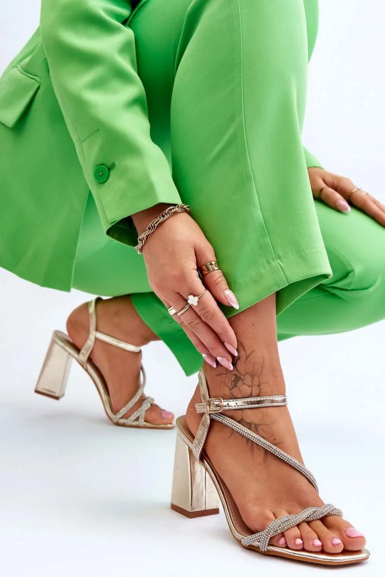 Damskie sandały zostały wykonane z eko skóry. Posiadają z przodu przeplatające się paski z dżetami imitującymi cyrkonie oraz paseczek znajdujący się na środku sandałek. Wygodna wkładka z eko skóry pozwoli na komfortowe użytkowanie obuwia. Buty posiadają regulowany pasek zapinany na sprzączkę wokół kostki. Ten model powinien być Twój! Przy wyborze rozmiaru prosimy sugerować się tabelą rozmiarów.