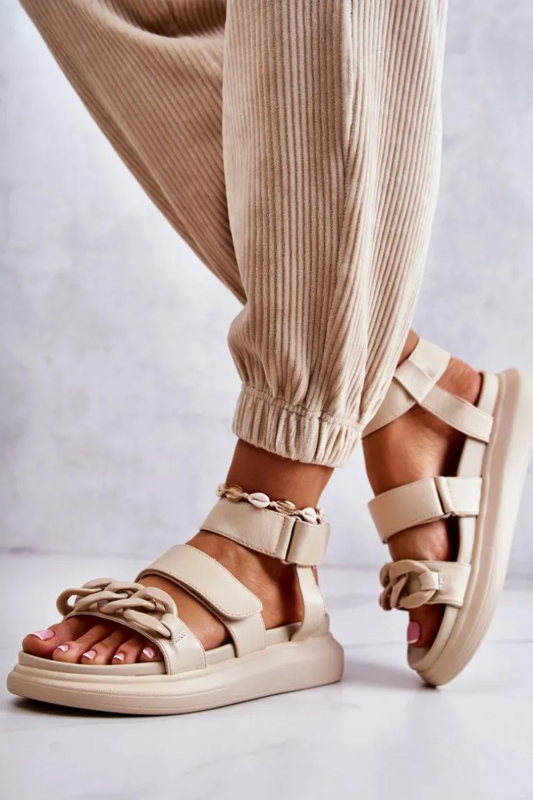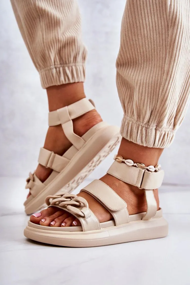 Śliczne sandały damskie od marki La.Fi. Wykonane z wysokiej jakości eko skóry. Paseczki świetnie stabilizują stopę podczas użytkowania. Na przodzie znajduje się ozdobny łańcuch wykonany z tworzywa sztucznego. Paseczki są zapinane na rzepy, więc możesz odpowiednio dopasować buty do tęgości nogi. Osadzone na masywnej platformie wykonanej z tworzywa sztucznego. Idealny model na lato – przewiewny, a zarazem wygodny. Przy wyborze rozmiaru prosimy sugerować się tabelą rozmiarów.