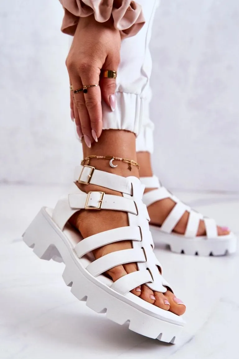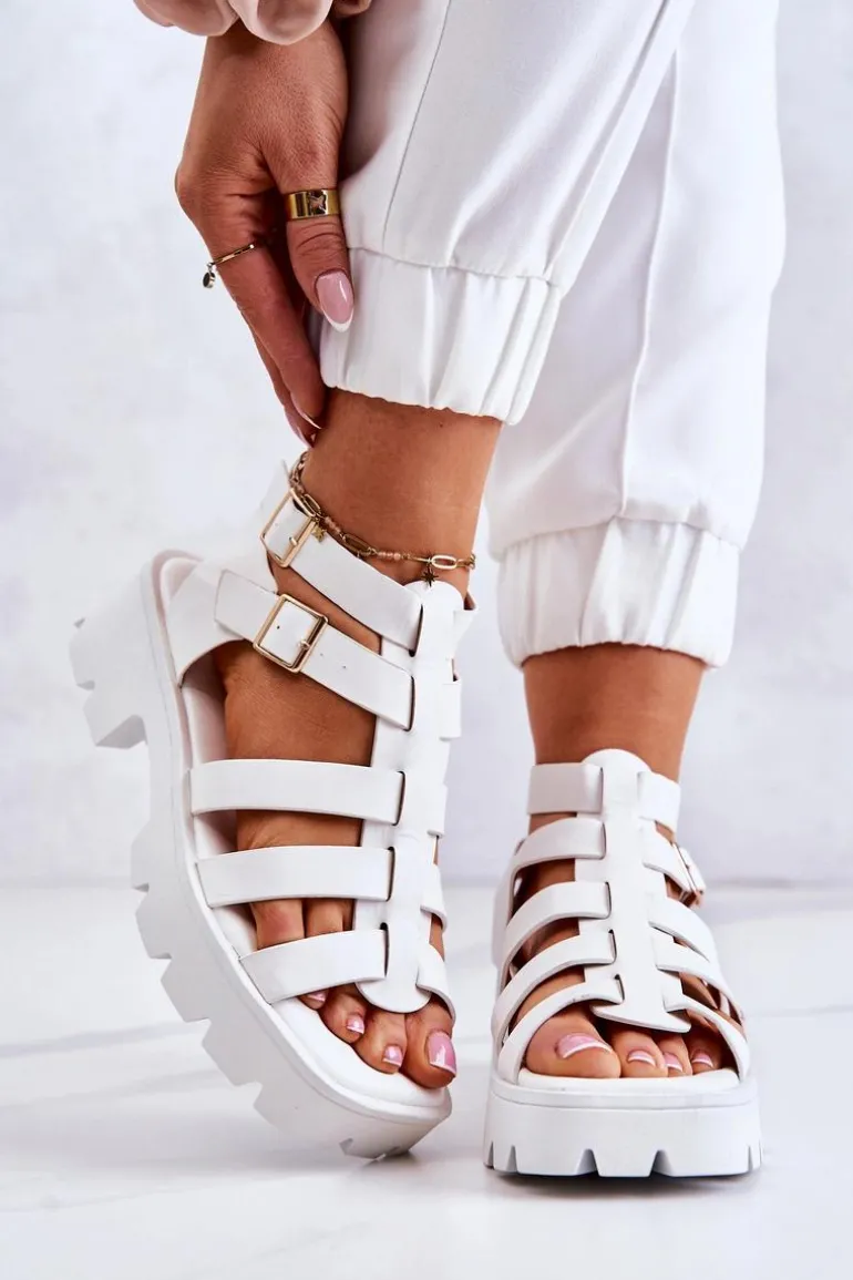 Przewiewne sandały wykonane z eko skóry. Paseczki świetnie podtrzymują stopę. Zapinane na regulowane paski ze sprzączką. Sandałki posiadają odkryty, kwadratowy nosek oraz odkrytą piętę. Miękka, eko skórzana wkładka zapewni wygodę podczas użytkowania. Płaski, masywny obcas oraz platforma sprawiają, że buty są niezwykle stabilne. Te sandałki to idealny fason na upalne dni. Świetnie będą prezentować się z zarówno ze spodniami, jak i sukienkami. Przy wyborze rozmiaru prosimy sugerować się tabelą rozmiarów.