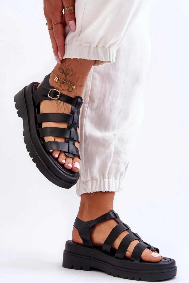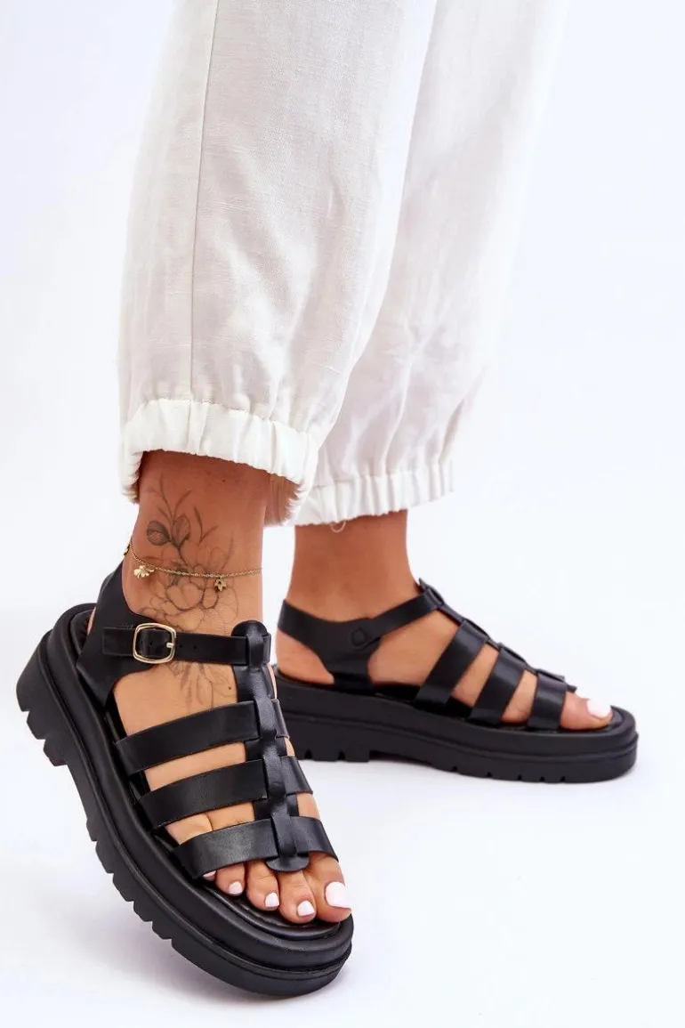 Przewiewne sandały damskie zostały wykonane z eko skóry. Zapinane na regulowany pasek ze sprzączką. Sandałki posiadają odkryty, lekko kwadratowy nosek oraz odkrytą piętę. Miękka, eko skórzana wkładka zapewni wygodę podczas użytkowania. Płaski obcas oraz platforma sprawiają, że buty są niezwykle stabilne. Te sandałki to idealny fason na upalne dni. Świetnie będą prezentować się z zarówno ze spodniami, jak i sukienkami. Przy wyborze rozmiaru prosimy sugerować się tabelą rozmiarów.