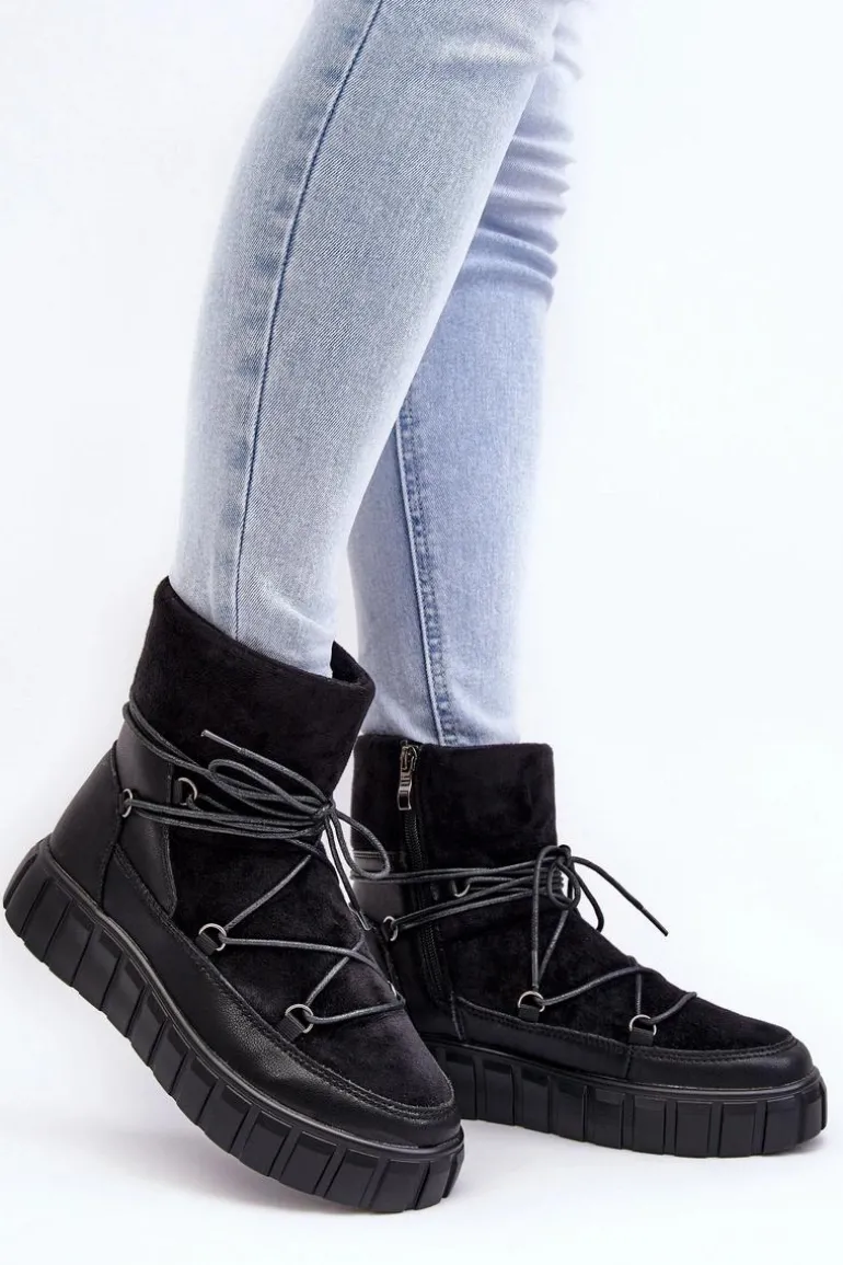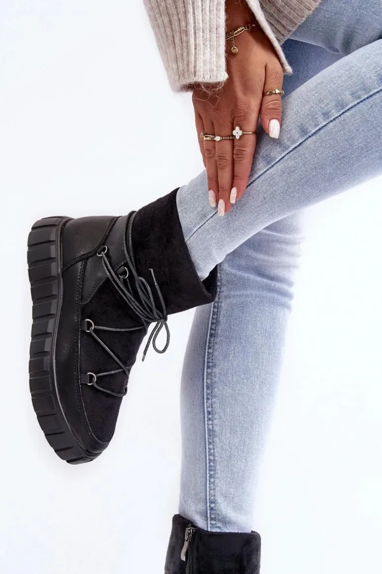 Świetne, damskie śniegowce zostały wykonane ze skóry naturalnej. Zapinane na suwak z boku oraz dodatkowo posiadają sznurówki. Osadzone na platformie. Środek ocieplony kocem obuwniczym. Ten model z pewnością przyda się każdej miłośniczce ciepłego i wygodnego obuwia! Przy wyborze rozmiaru prosimy sugerować się tabelą rozmiarów.