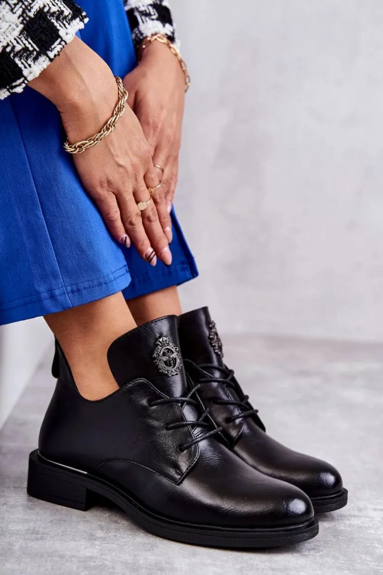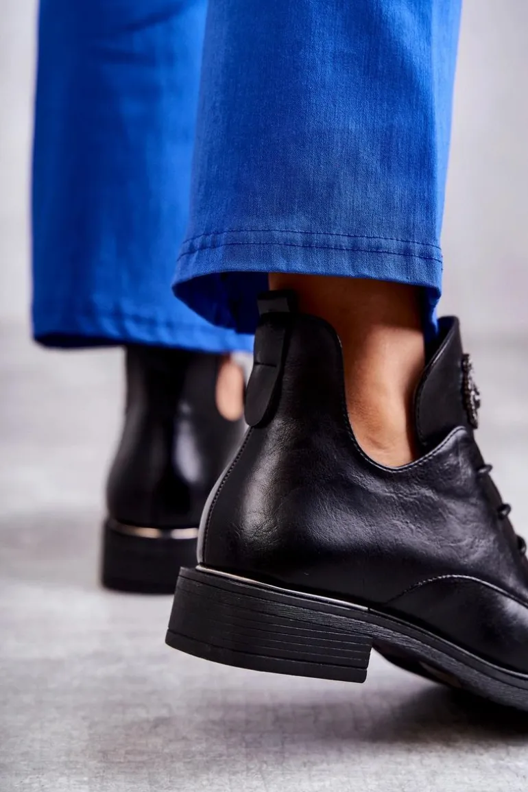 Botki damskie z cholewką wykonaną z eko skóry i modnymi wycięciami. Botki zostały przyozdobione elementem z tworzywa sztucznego. Model klasycznie sznurowany. Buty te zostały osadzone na płaskim obcasie. Środek ocieplony kocem obuwniczym sprawi, że chłodne dni nie będą już takie straszne! Ten model powinien być Twój! Przy wyborze rozmiaru prosimy sugerować się tabelą rozmiarów.