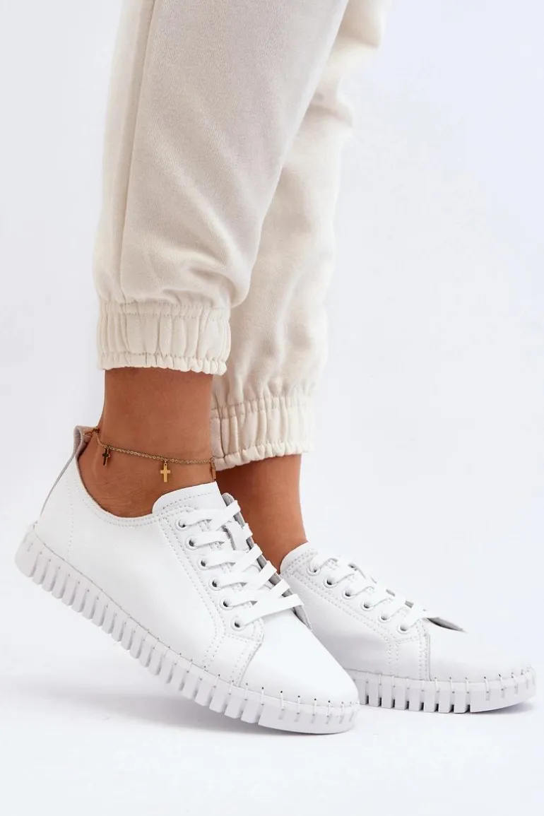 Trampki damskie wykonane z wysokiej jakości naturalnej skóry, co gwarantuje trwałość i komfort noszenia. Ich klasyczny design pozwala na łatwe dopasowanie do różnych stylizacji, a sznurowanie zapewnia pewne trzymanie stopy. Dodatkowo buty posiadają antypoślizgową podeszwę, co sprawia, że są one bezpieczne i stabilne nawet na różnych rodzajach nawierzchni. Wkładka z naturalnej skóry zapewnia dodatkowy komfort podczas długiego noszenia. Model ten to absolutny must-have w Twojej kolekcji obuwia! Przy wyborze rozmiaru prosimy sugerować się tabelą rozmiarów.