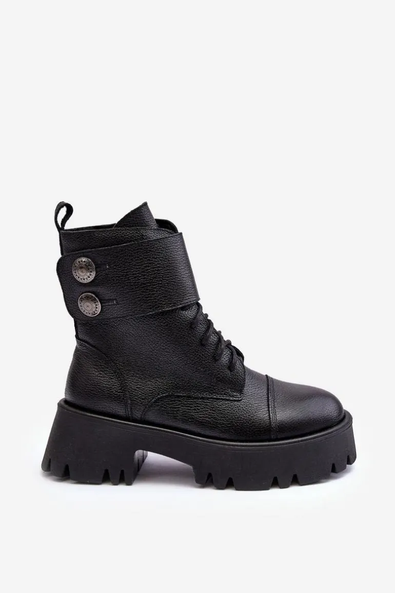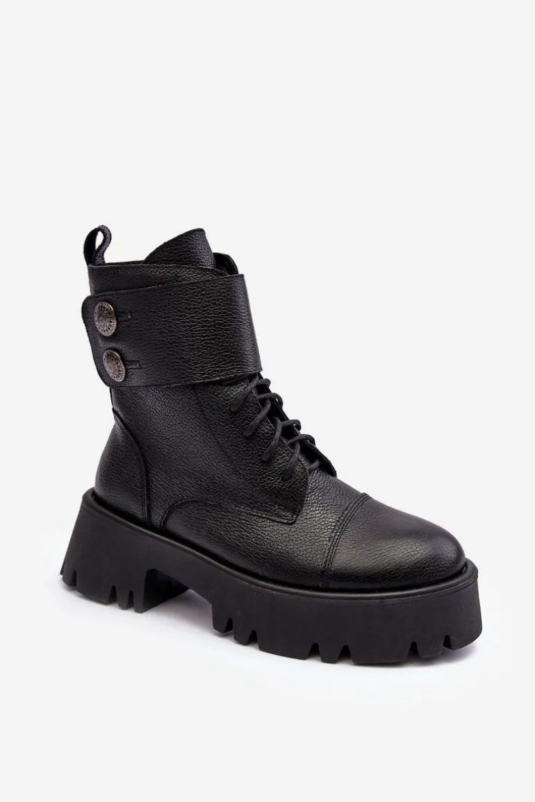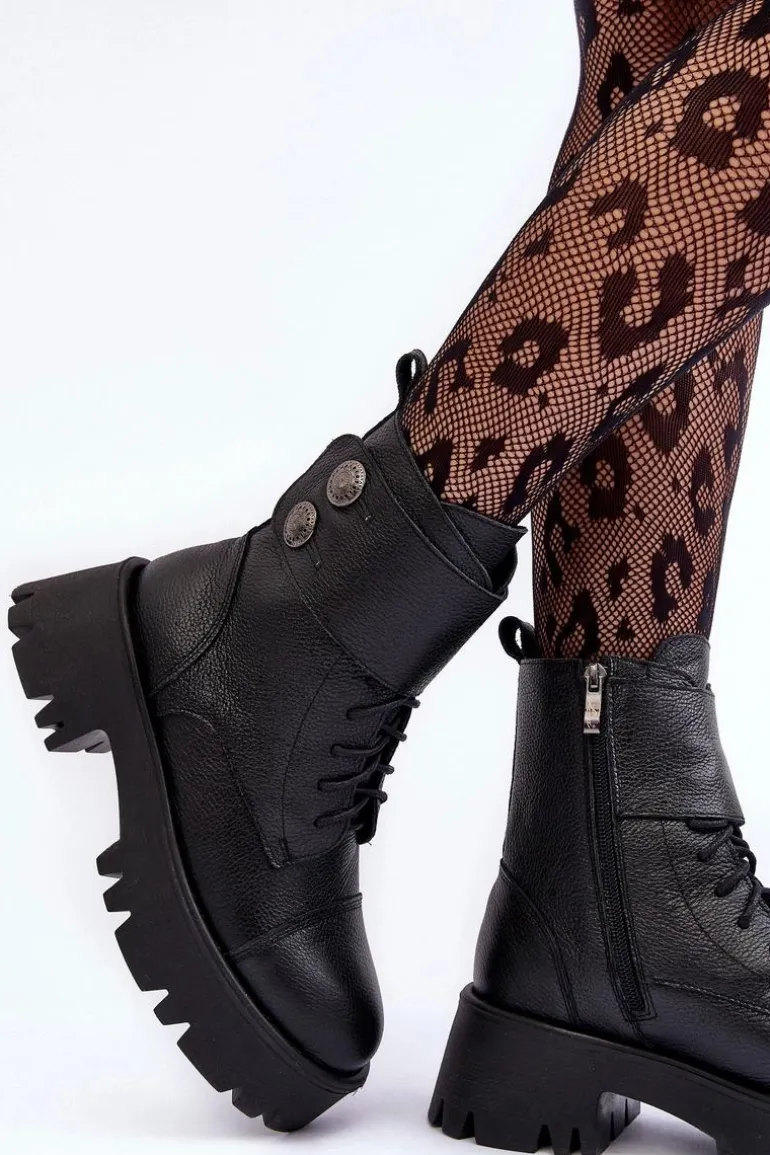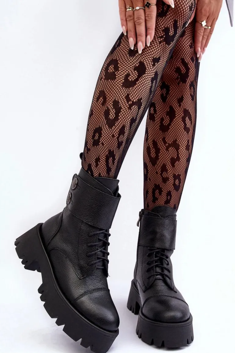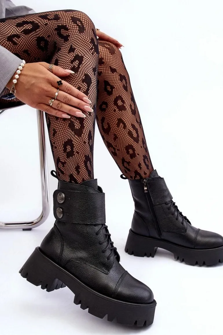 Botki damskie wykonane ze skóry naturalnej. Osadzone na masywnym, płaskim obcasie i platformie. Zapinane na suwak z boku. Cholewka ozdobiona szerokim paskiem. Wnętrze ocieplone kocem obuwniczym. Podeszwa jest antypoślizgowa. Model ten będzie pasować do wielu jesienno-zimowych stylizacji! Przy wyborze rozmiaru prosimy kierować się tabelą rozmiarów