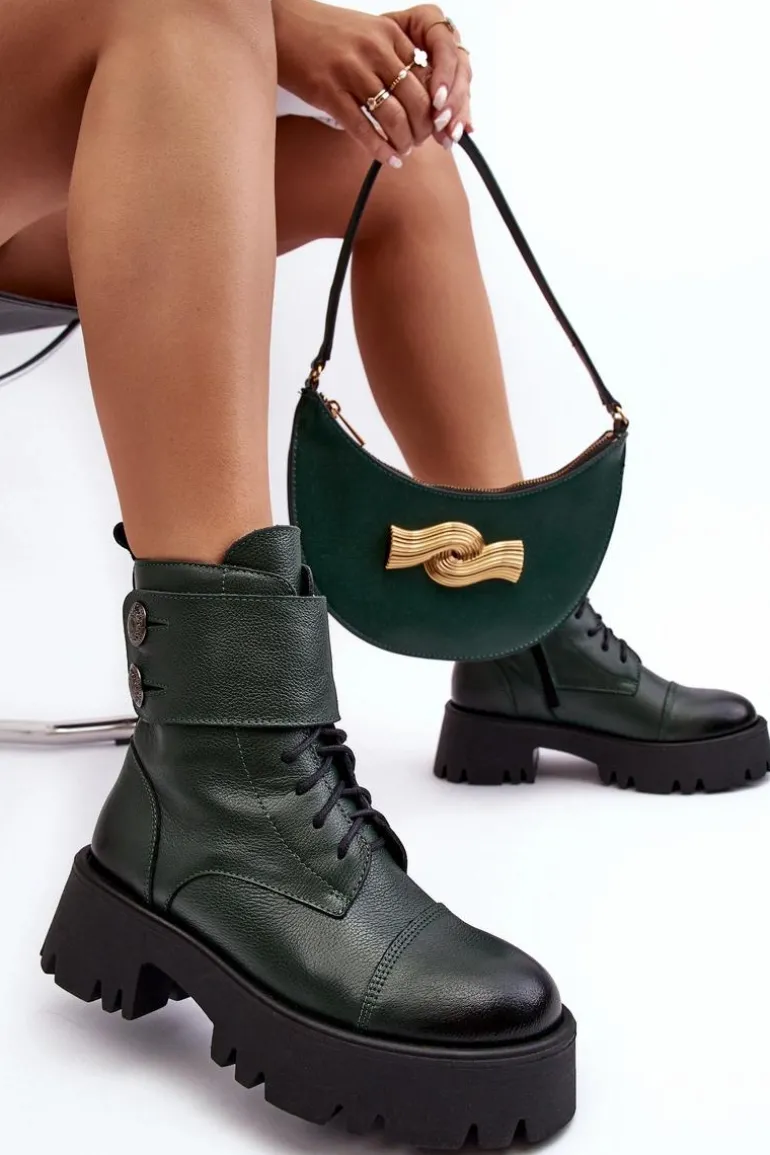 Botki damskie wykonane ze skóry naturalnej. Osadzone na masywnym, płaskim obcasie i platformie. Zapinane na suwak z boku. Cholewka ozdobiona szerokim paskiem. Wnętrze ocieplone kocem obuwniczym. Podeszwa jest antypoślizgowa. Model ten będzie pasować do wielu jesienno-zimowych stylizacji! Przy wyborze rozmiaru prosimy kierować się tabelą rozmiarów