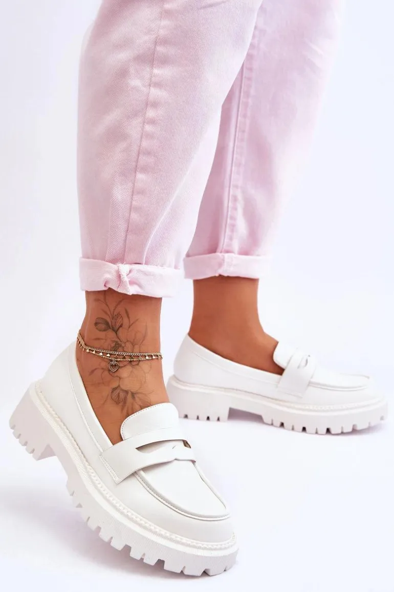 Wygodne, damskie mokasyny zostały wykonane z eko skóry. Model ten posiada na przodzie paseczek z delikatnym wycięciem. Mokasyny osadzono na płaskim, masywnym obcasie oraz platformie. Zapiętek został delikatnie usztywniony. Świetny model do wielu stylizacji w sezonie wiosenno-jesiennym. Przy wyborze rozmiaru prosimy sugerować się tabelą rozmiarów.