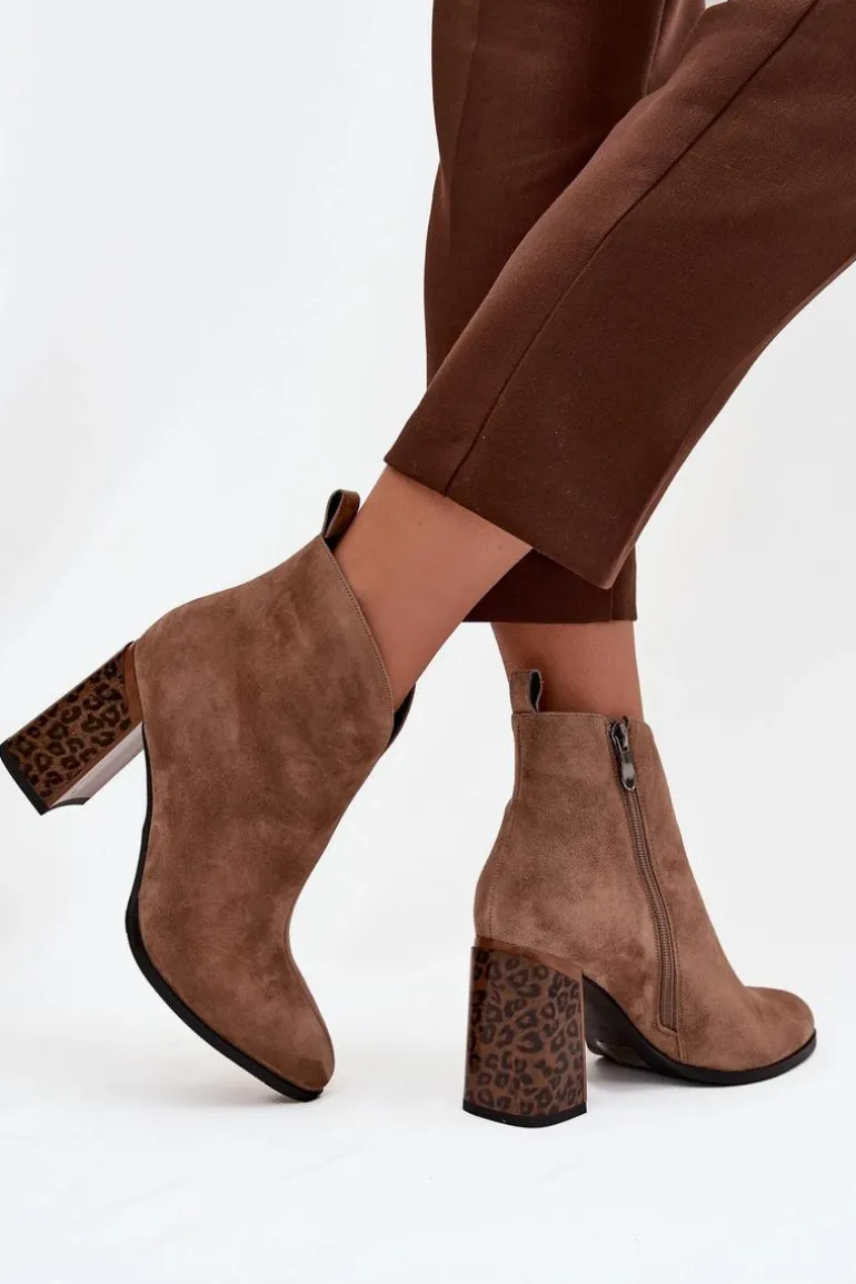 Botki damskie z naturalnego zamszu to propozycja łącząca klasykę z modnym akcentem. Zapinane na zamek, są wygodne w zakładaniu i zdejmowaniu. Osadzone na stabilnym obcasie typu słupek w panterkowy wzór, wyróżniają się oryginalnym wyglądem i przyciągają wzrok. Wnętrze butów zostało ocieplone kocem obuwniczym, co gwarantuje komfort i ciepło w chłodniejsze dni. Dodatkowym detalem jest przeszycie biegnące wzdłuż cholewki, które podkreśla elegancki charakter modelu. To botki idealne do jesiennych i zimowych stylizacji – świetnie sprawdzą się zarówno na co dzień, jak i w bardziej eleganckich zestawach.