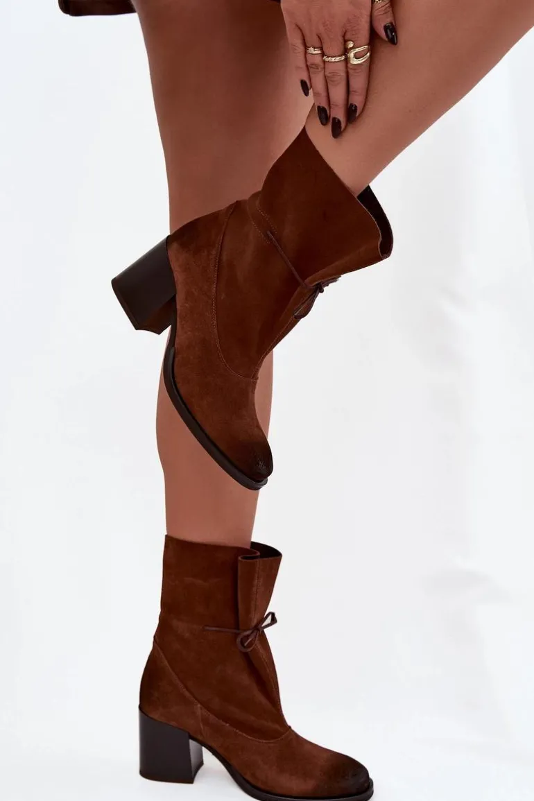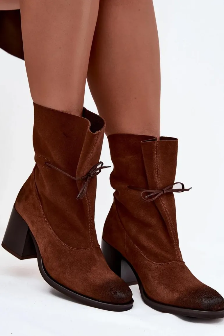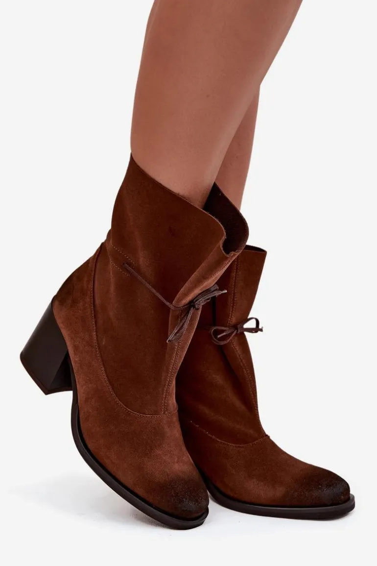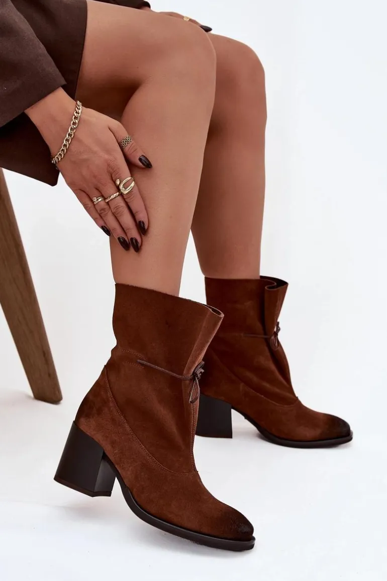 Botki damskie wykonane z naturalnego zamszu to elegancka propozycja dla kobiet ceniących styl i wygodę. Model wsuwany prezentuje się nowocześnie, a obcas w formie stabilnego słupka dodaje sylwetce lekkości i zapewnia komfort noszenia. Na cholewce znajduje się delikatny sznureczek, który pozwala dopasować botki do nogi i subtelnie podkreśla ich kobiecy charakter. To uniwersalny model, który doskonale sprawdzi się zarówno w codziennych, jak i bardziej eleganckich stylizacjach. Przy wyborze rozmiaru prosimy kierować się tabelą rozmiarów.