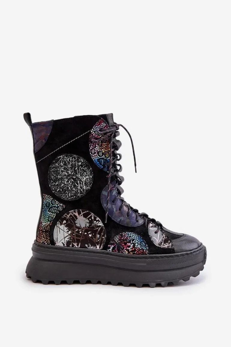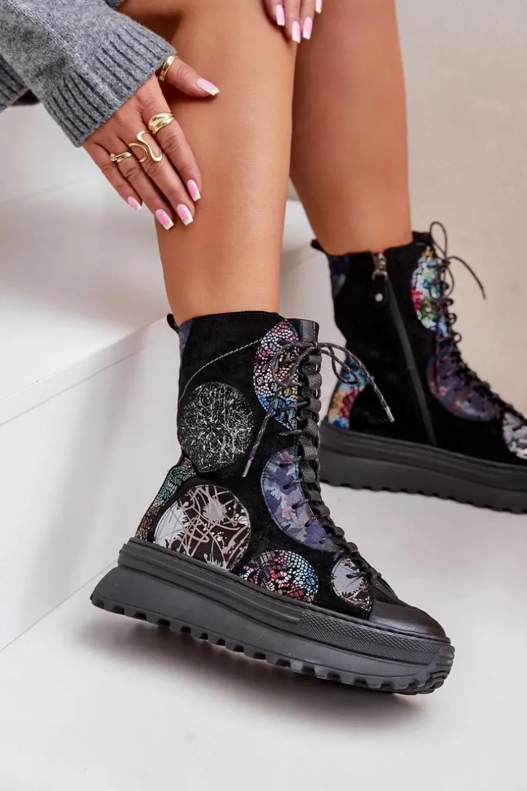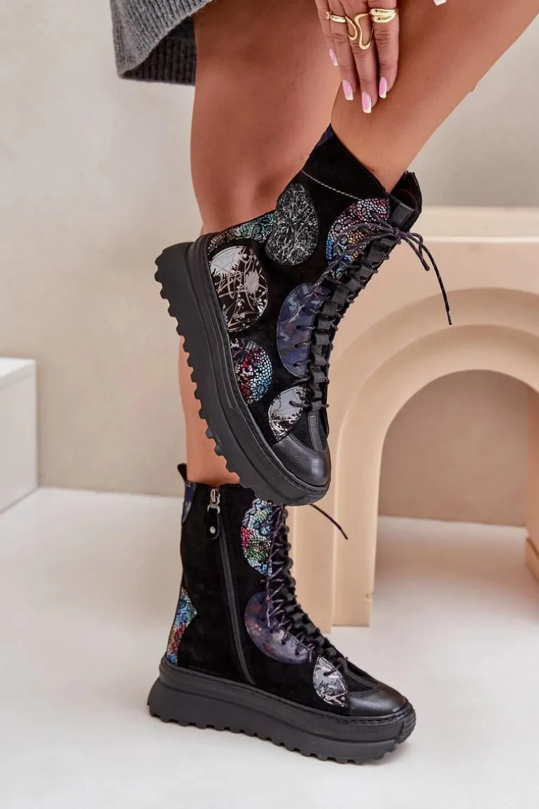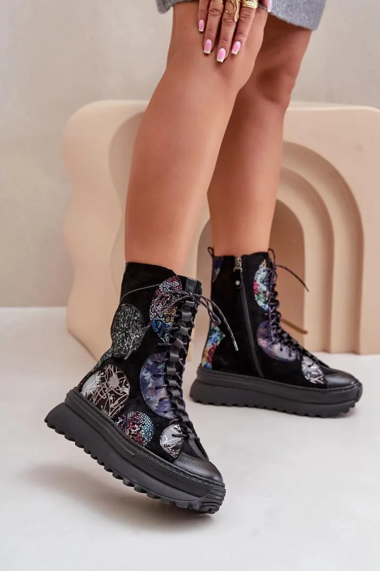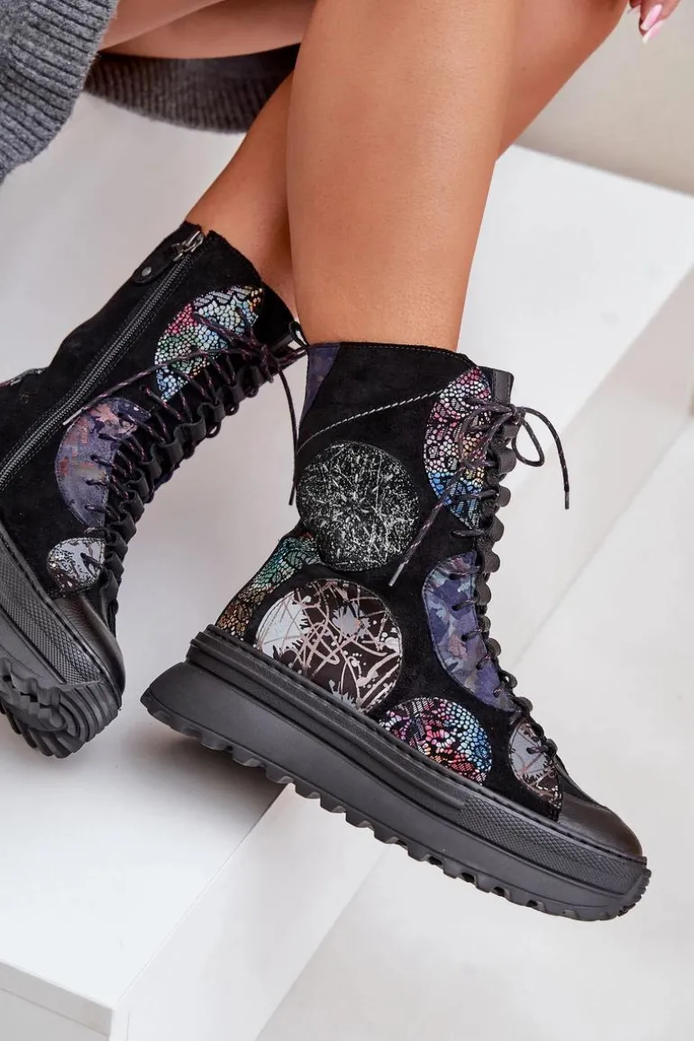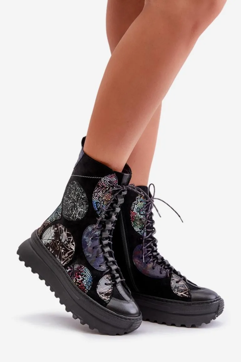 Botki marki Maciejka wykonane z naturalnego zamszu to stylowy wybór na chłodniejsze dni. Osadzone na platformie, wyróżniają się ozdobnymi elementami na cholewce, które dodają im charakteru. Model zapinany na zamek i sznurowany, zapewnia wygodne dopasowanie. Ocieplane wnętrze gwarantuje ciepło i komfort podczas noszenia, dzięki czemu idealnie sprawdzą się w jesienno-zimowych stylizacjach. Przy wyborze rozmiaru prosimy sugerować się tabelą rozmiarów.
