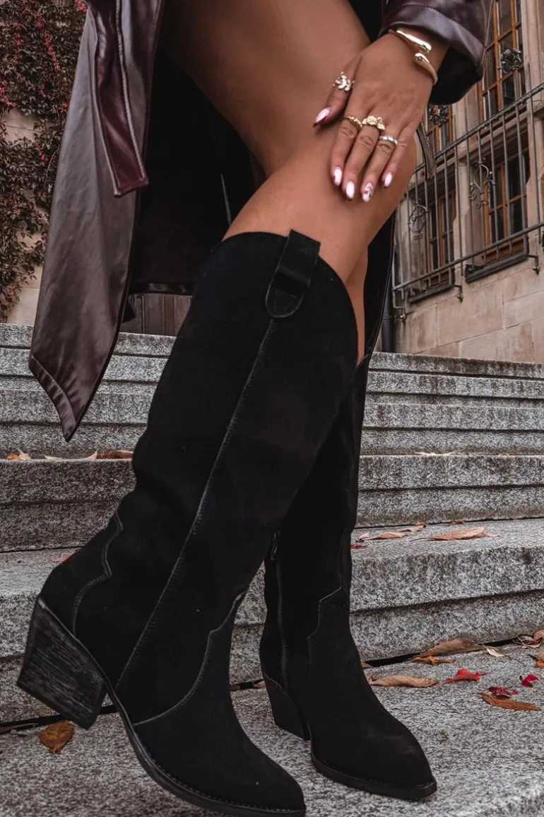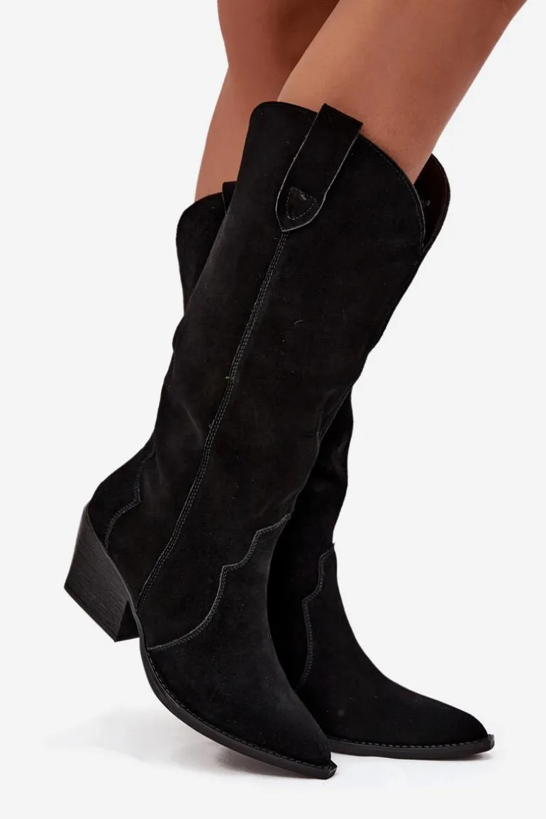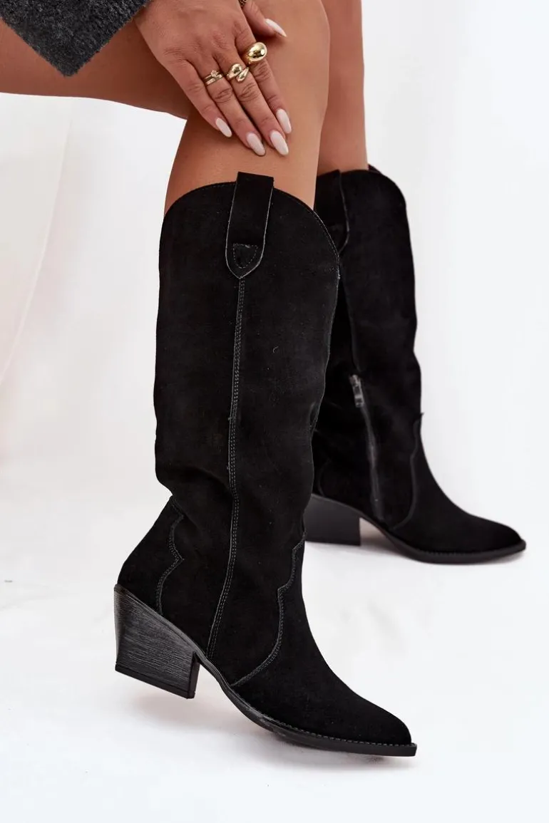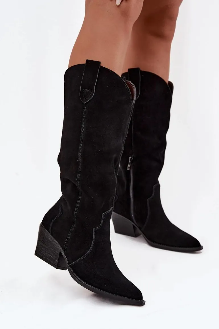 Kozaki kowbojki wykonane z wysokiej jakości naturalnego zamszu to idealna propozycja dla kobiet, które cenią połączenie elegancji i modnego charakteru. Ich wyjątkowy design inspirowany stylem westernowym sprawia, że stanowią efektowny element każdej stylizacji. Model wsuwany oraz zapiany na suwak w dolnej części cholewki, ułatwia zakładanie i zdejmowanie, zachowując przy tym zgrabny fason. Osadzone na stabilnym, ściętym obcasie typu słupek, zapewniają wygodę podczas chodzenia, a jednocześnie delikatnie wysmuklają nogi i dodają sylwetce lekkości. Szpiczaste noski podkreślają kobiecy charakter obuwia, nadając im eleganckiego wyrazu. Wnętrze kozaków zostało ocieplone miękkim kocem obuwniczym, który gwarantuje komfort termiczny nawet w chłodniejsze dni. Doskonale sprawdzą się w stylizacjach z sukienkami, spódnicami i spodniami typu skinny. Przy wyborze rozmiaru prosimy sugerować się tabelą rozmiarów.