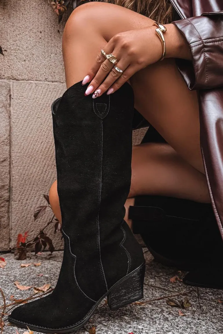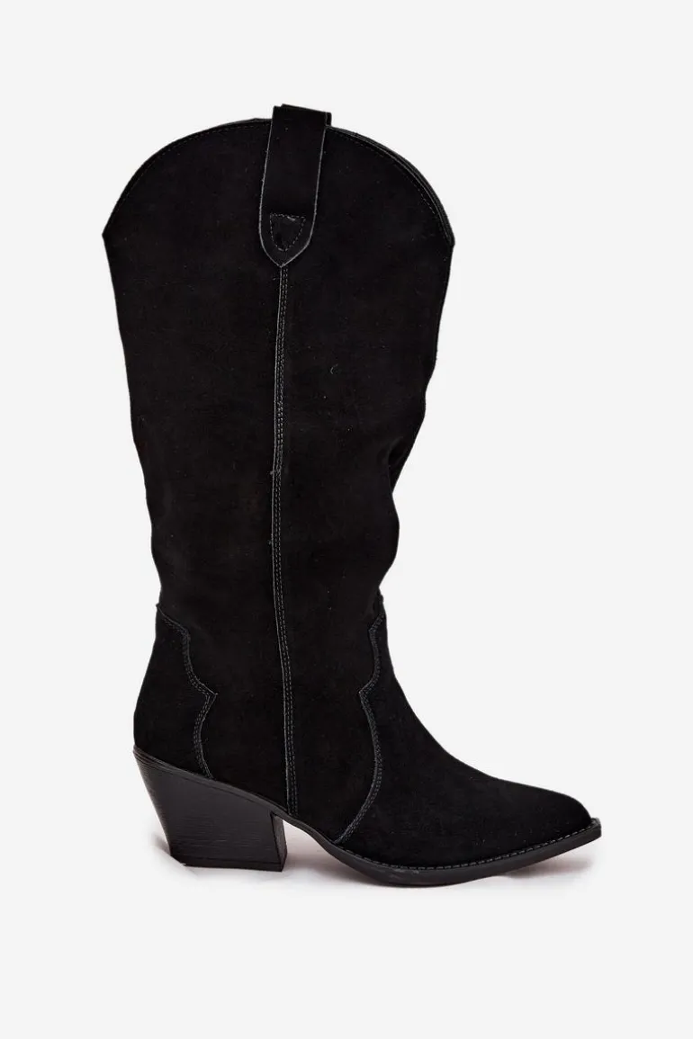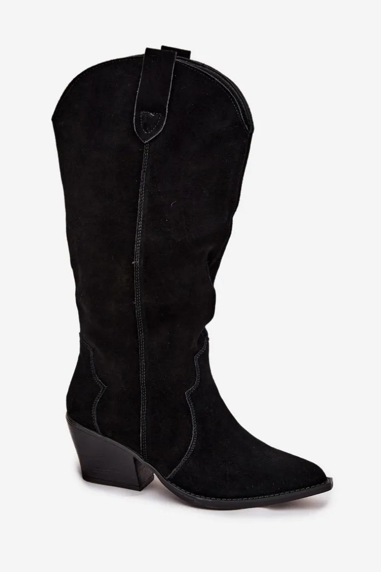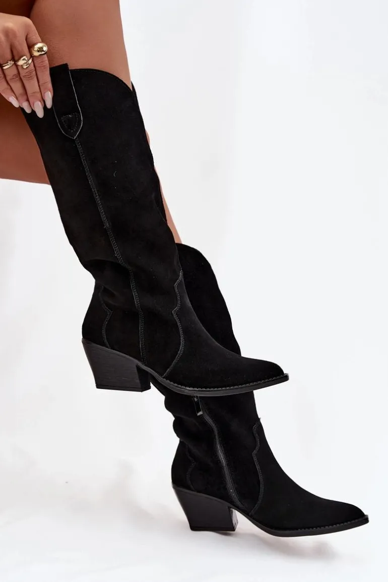 Kozaki kowbojki wykonane z wysokiej jakości naturalnego zamszu to idealna propozycja dla kobiet, które cenią połączenie elegancji i modnego charakteru. Ich wyjątkowy design inspirowany stylem westernowym sprawia, że stanowią efektowny element każdej stylizacji. Model wsuwany oraz zapiany na suwak w dolnej części cholewki, ułatwia zakładanie i zdejmowanie, zachowując przy tym zgrabny fason. Osadzone na stabilnym, ściętym obcasie typu słupek, zapewniają wygodę podczas chodzenia, a jednocześnie delikatnie wysmuklają nogi i dodają sylwetce lekkości. Szpiczaste noski podkreślają kobiecy charakter obuwia, nadając im eleganckiego wyrazu. Wnętrze kozaków zostało ocieplone miękkim kocem obuwniczym, który gwarantuje komfort termiczny nawet w chłodniejsze dni. Doskonale sprawdzą się w stylizacjach z sukienkami, spódnicami i spodniami typu skinny. Przy wyborze rozmiaru prosimy sugerować się tabelą rozmiarów.