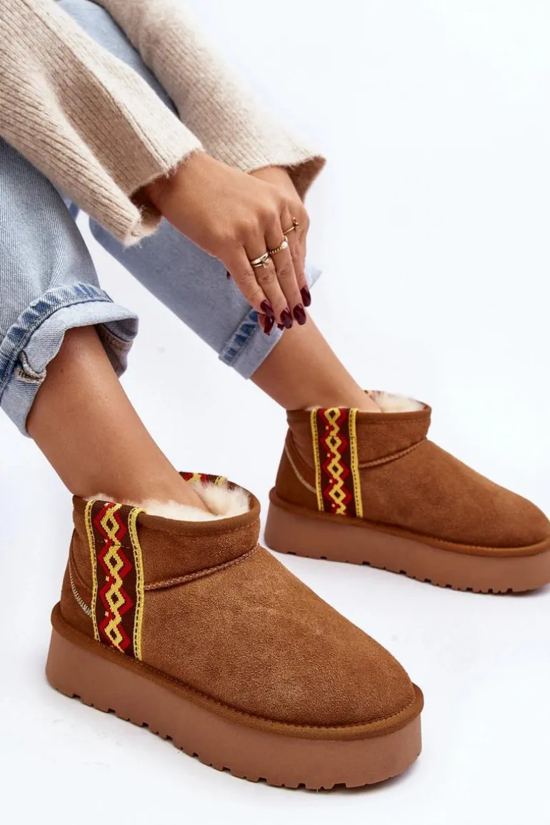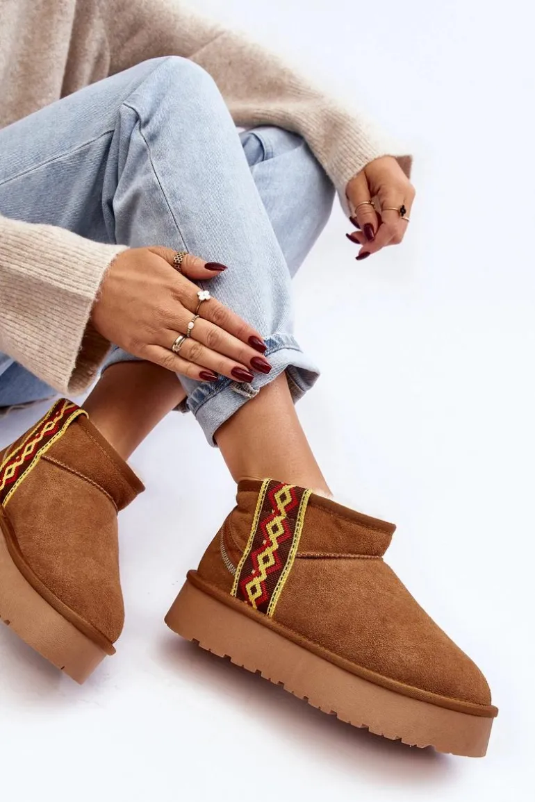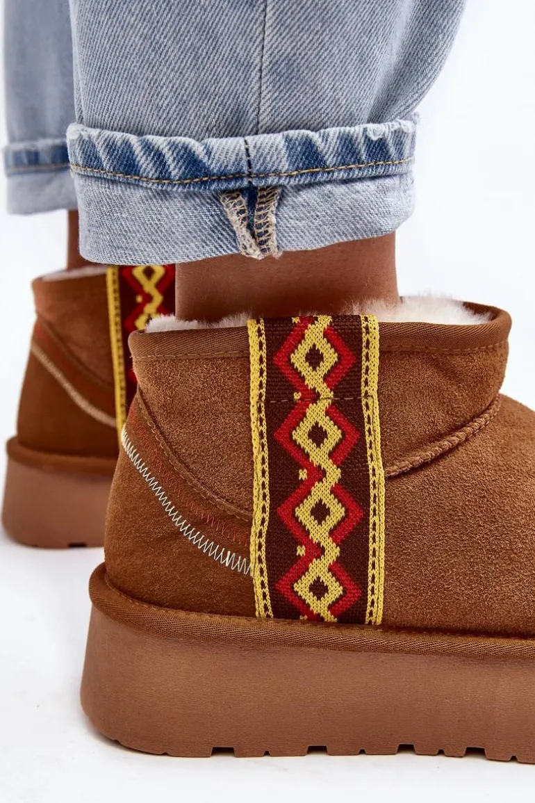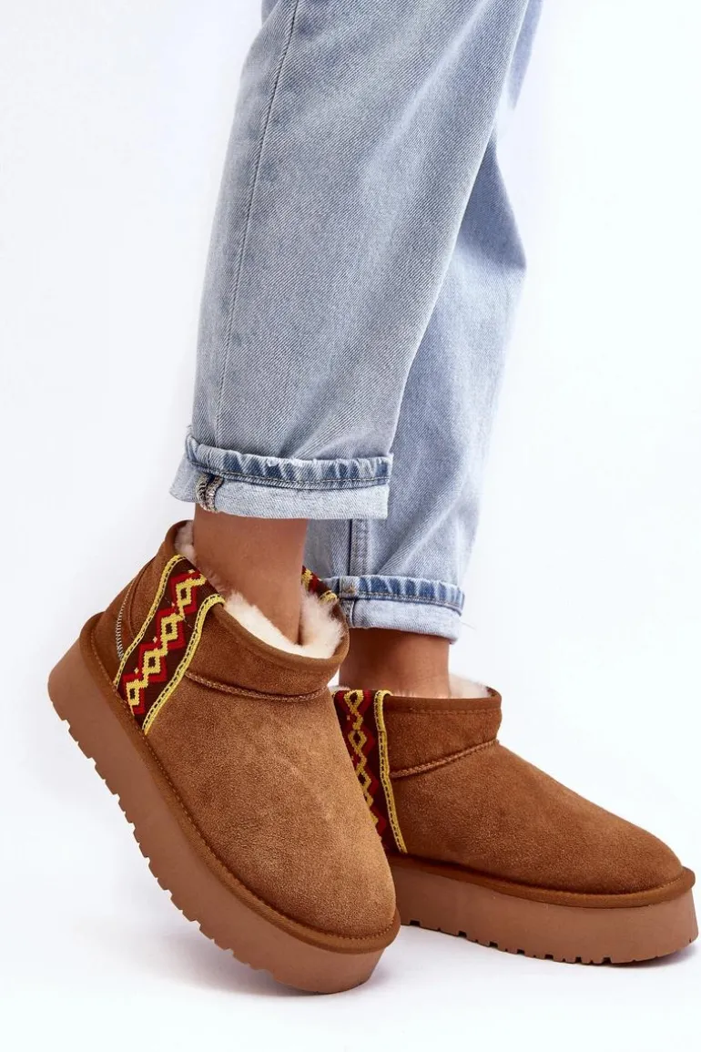 Modne śniegowce damskie ozdobione azteckim wzorem. Wykonane z naturalnego zamszu. Osadzone na grubej, antypoślizgowej podeszwie, która świetnie odizoluje od zimnego podłoża. Cholewka do kostki. Dodatkowo model ten posiada usztywniony zapiętek. Środek ocieplony kocem obuwniczym. Koniecznie musisz je mieć! Przy wyborze rozmiaru prosimy sugerować się tabelą rozmiarów.