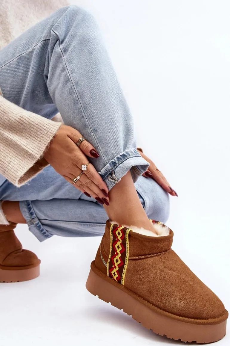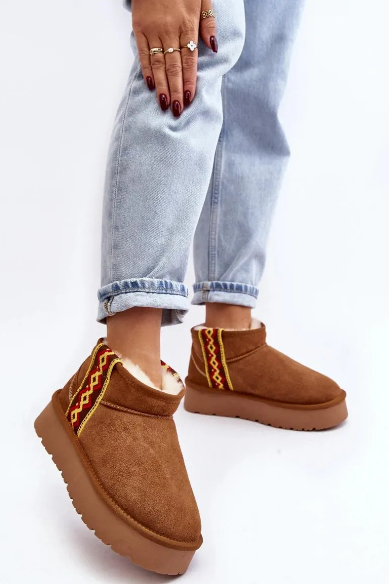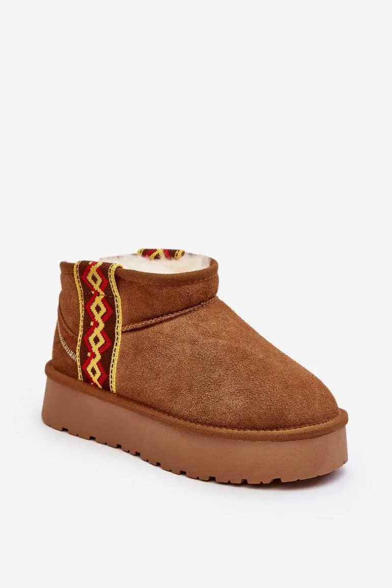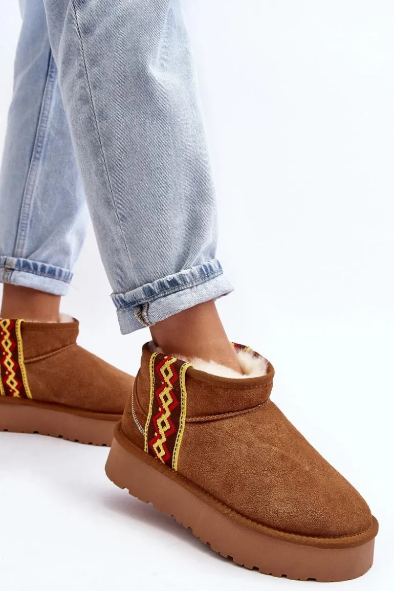 Modne śniegowce damskie ozdobione azteckim wzorem. Wykonane z naturalnego zamszu. Osadzone na grubej, antypoślizgowej podeszwie, która świetnie odizoluje od zimnego podłoża. Cholewka do kostki. Dodatkowo model ten posiada usztywniony zapiętek. Środek ocieplony kocem obuwniczym. Koniecznie musisz je mieć! Przy wyborze rozmiaru prosimy sugerować się tabelą rozmiarów.