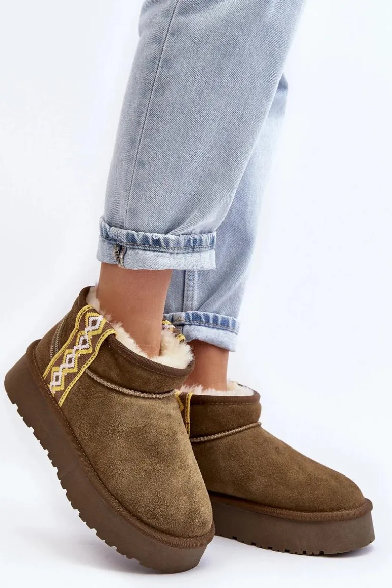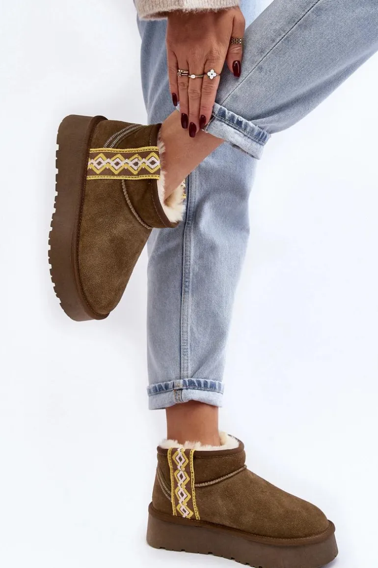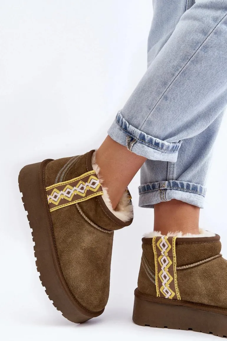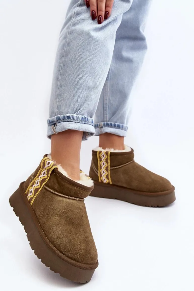 Modne śniegowce damskie ozdobione azteckim wzorem. Wykonane z naturalnego zamszu. Osadzone na grubej, antypoślizgowej podeszwie, która świetnie odizoluje od zimnego podłoża. Cholewka do kostki. Dodatkowo model ten posiada usztywniony zapiętek. Środek ocieplony kocem obuwniczym. Koniecznie musisz je mieć! Przy wyborze rozmiaru prosimy sugerować się tabelą rozmiarów.