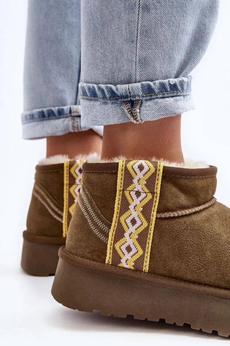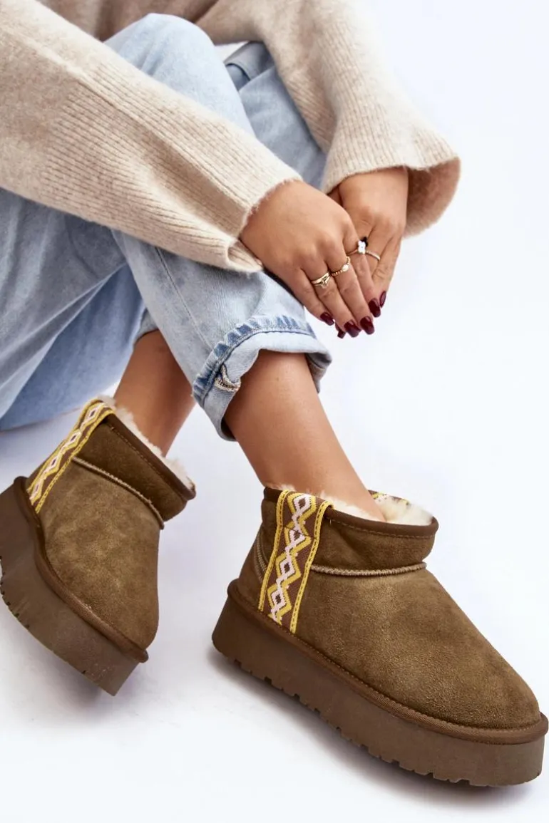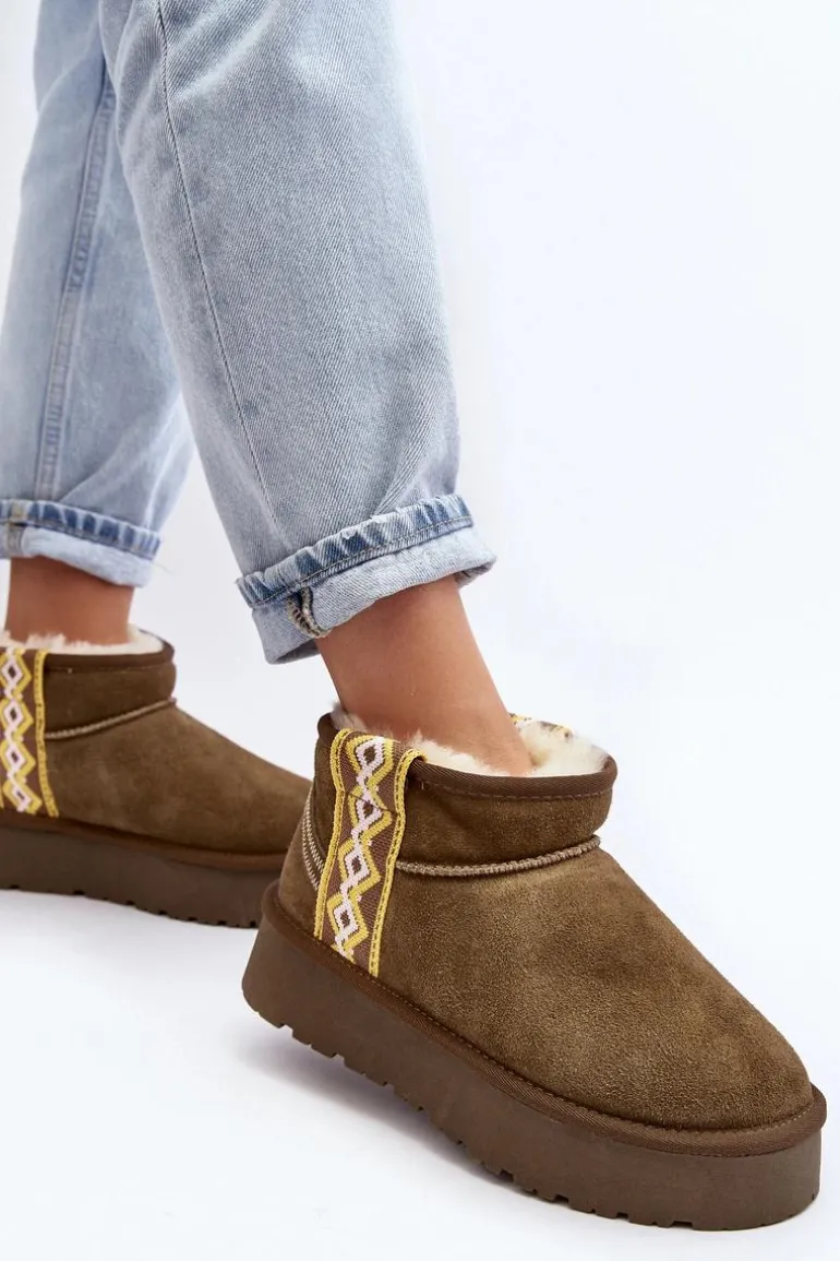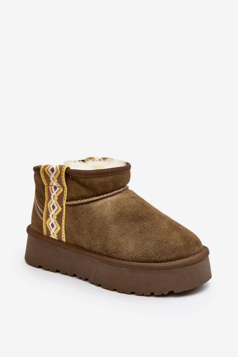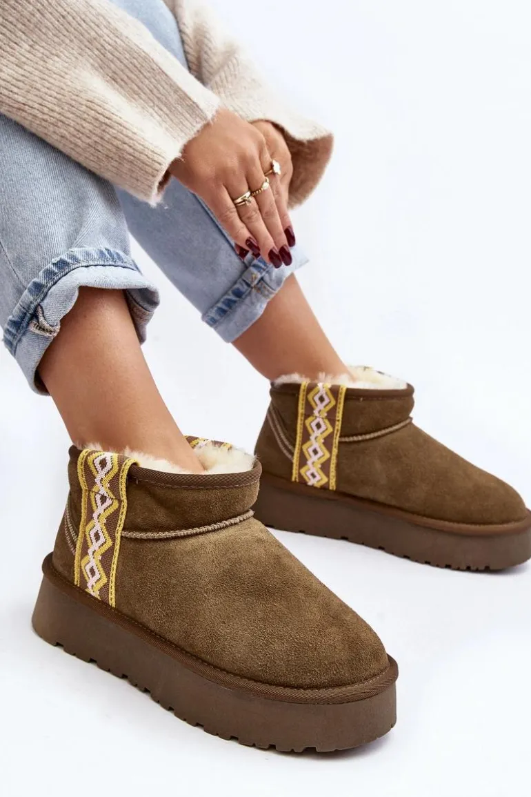 Modne śniegowce damskie ozdobione azteckim wzorem. Wykonane z naturalnego zamszu. Osadzone na grubej, antypoślizgowej podeszwie, która świetnie odizoluje od zimnego podłoża. Cholewka do kostki. Dodatkowo model ten posiada usztywniony zapiętek. Środek ocieplony kocem obuwniczym. Koniecznie musisz je mieć! Przy wyborze rozmiaru prosimy sugerować się tabelą rozmiarów.