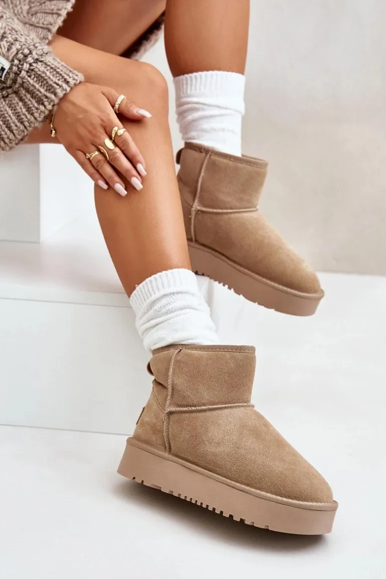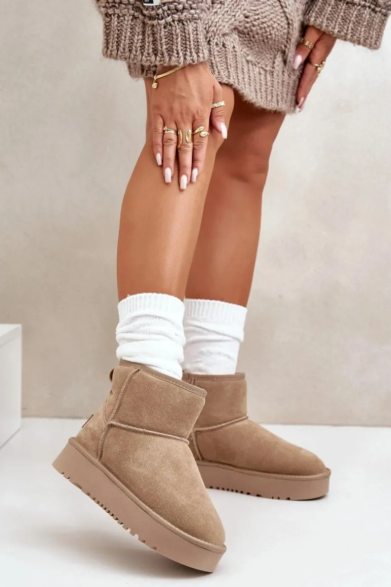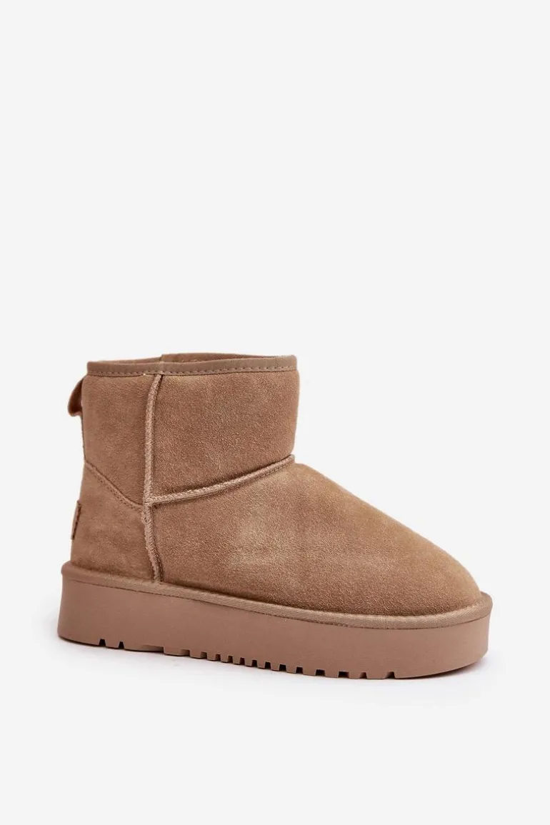 Stylowe śniegowce to doskonały wybór na mroźne dni. Wykonane z naturalnego zamszu, zapewniają elegancję i trwałość. Wnętrze butów wyściełane jest ciepłym, grubym futerkiem, które gwarantuje komfort nawet przy niskich temperaturach. Osadzone na platformie, skutecznie chronią przed chłodem podłoża. To obowiązkowa pozycja w Twojej zimowej garderobie! Przy wyborze rozmiaru prosimy sugerować się tabelą rozmiarów.
