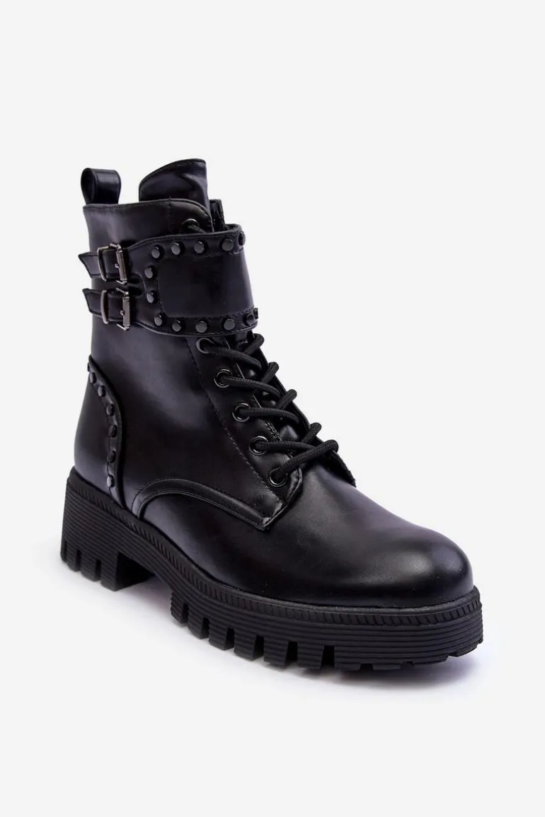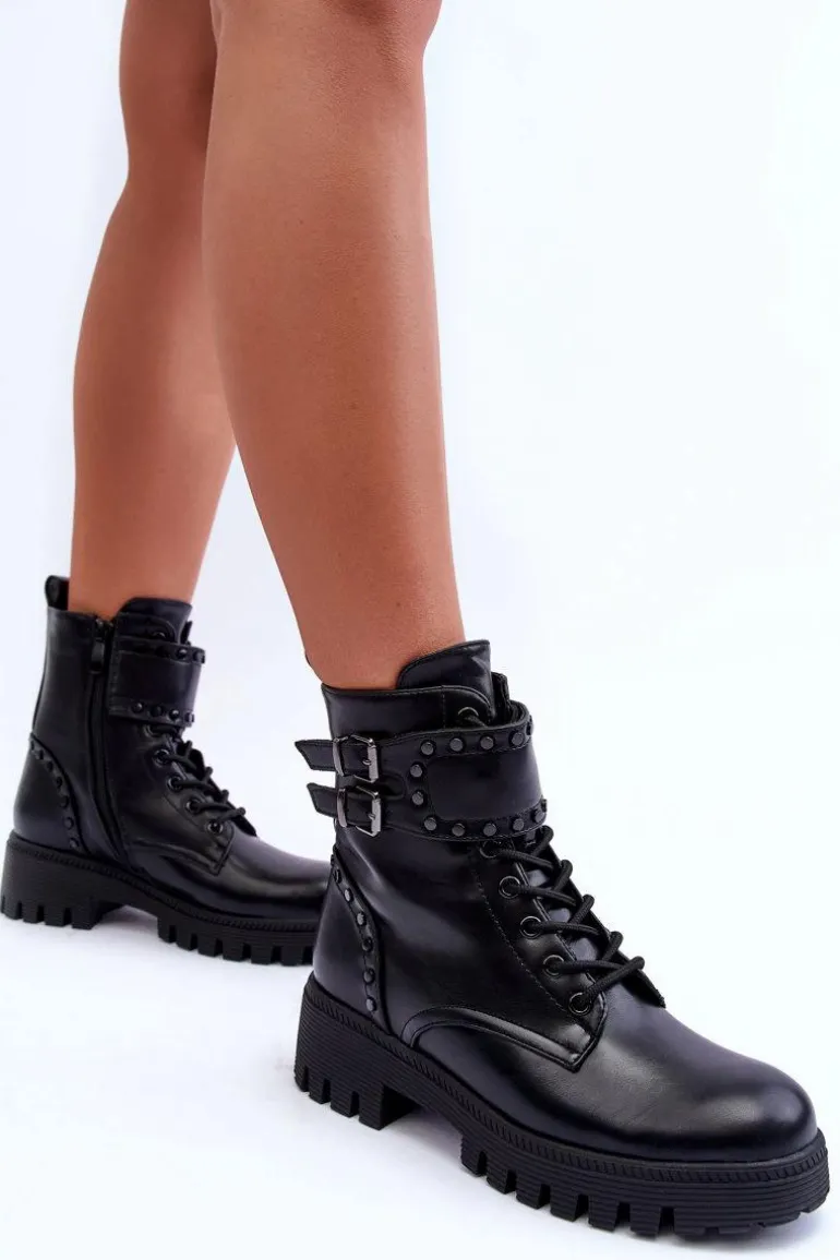 Stylowe botki damskie wykonane zostały eko skóry. Osadzone na płaskim obcasie i platformie. Zapinane na suwak z boku z dodatkowym sznurowaniem. Model ten został ozdobiony paskiem ze sprzączkami oraz dżetami. Idealne do jesiennych i zimowych stylizacji! Przy wyborze rozmiaru prosimy sugerować się tabelą rozmiarów.