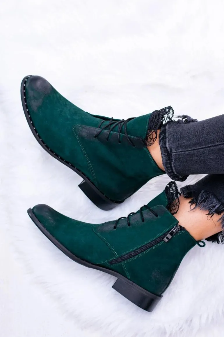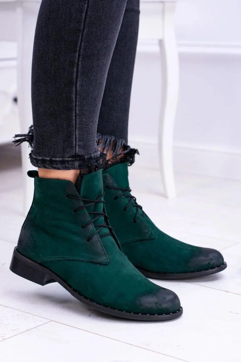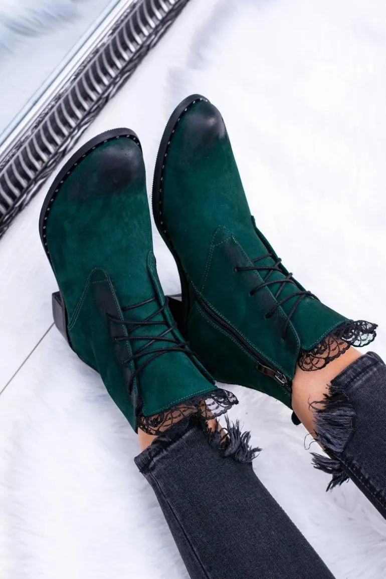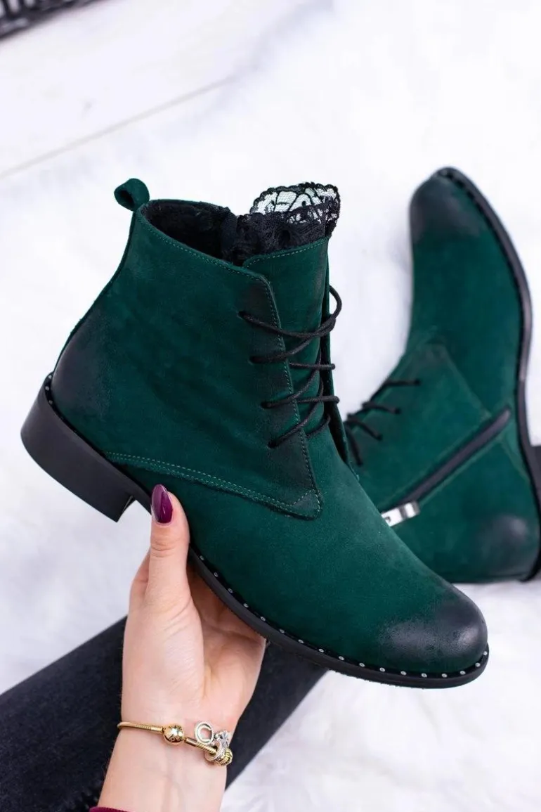 Skórzane Zielone Damskie Botki Z Koronką Millano