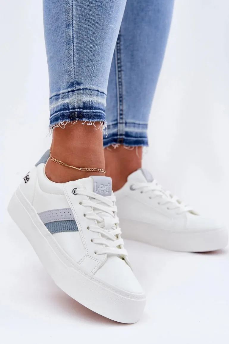 Damskie sneakersy od marki Lee, wykonane z wysokiej jakości eko skóry, to idealne połączenie stylu i komfortu. Osadzone na platformie, zapewniają dodatkową wysokość oraz stabilność. Klasyczne sznurowanie umożliwia idealne dopasowanie do stopy, a subtelne logo umieszczone z boku cholewki oraz na języku dodaje im nowoczesnego charakteru. Te sneakersy będą doskonałym wyborem do codziennych stylizacji, łącząc elegancję z funkcjonalnością. Przy wyborze rozmiaru prosimy sugerować się tabelą rozmiarów.