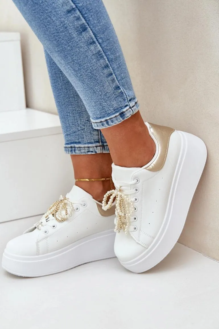 Sneakersy Damskie Na Platformie Z Ozdobami Biało-Złote Lerissna