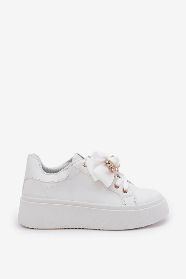 Buty sportowe damskie wykonane z eko skóry. Osadzone na platformie, zapewniają lekkość i stabilność. Sznurowanie butów ozdobione jest odpinaną kokardką, która dodaje im uroku, a do tego broszka z misiem oraz napis, wprowadzają subtelną nutę zabawy i oryginalności. Te sneakersy będą doskonałym wyborem do codziennych, casualowych stylizacji, łącząc wygodę z unikalnym stylem. Przy wyborze rozmiaru prosimy kierować się tabelą rozmiarów.