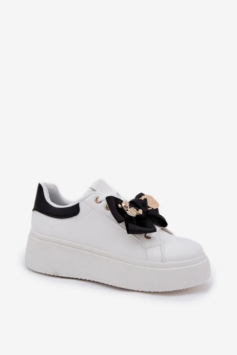Sneakersy Damskie Z Kokardką I Broszką Z Misiem Biało-Czarne Leathria