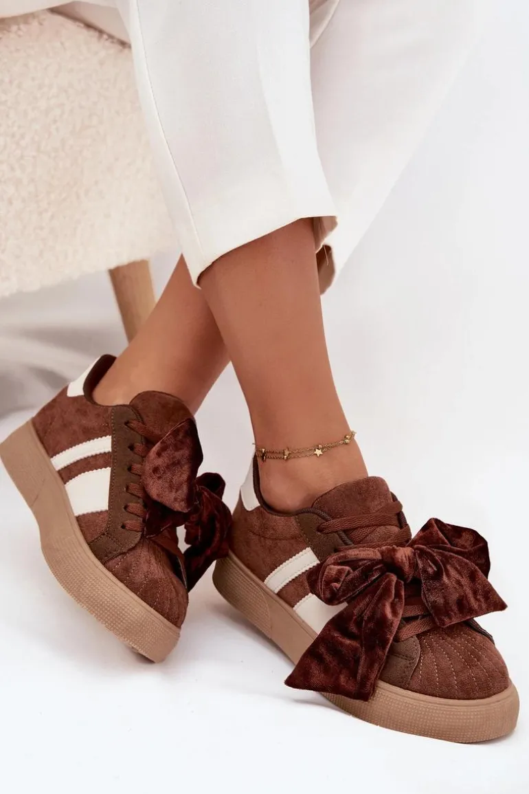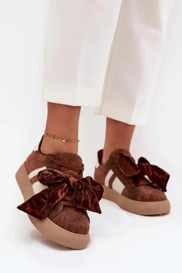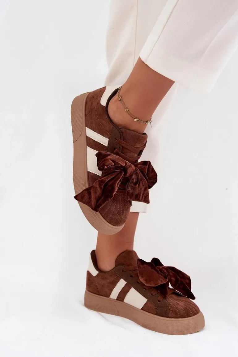 Sneakersy damskie wykonane z miękkiego eko zamszu to wygodne i jednocześnie stylowe obuwie na co dzień. Osadzone na platformie zapewniają komfort noszenia, a szerokie, zaokrąglone noski gwarantują swobodę dla stóp. Głównym atutem, który nadaje wyjątkowego charakteru, jest efektowna welurowa kokarda na sznurowaniu, która przyciąga spojrzenia i podkreślająca modny wygląd. To idealny model dla kobiet, które lubią łączyć sportową wygodę z kobiecymi detalami.