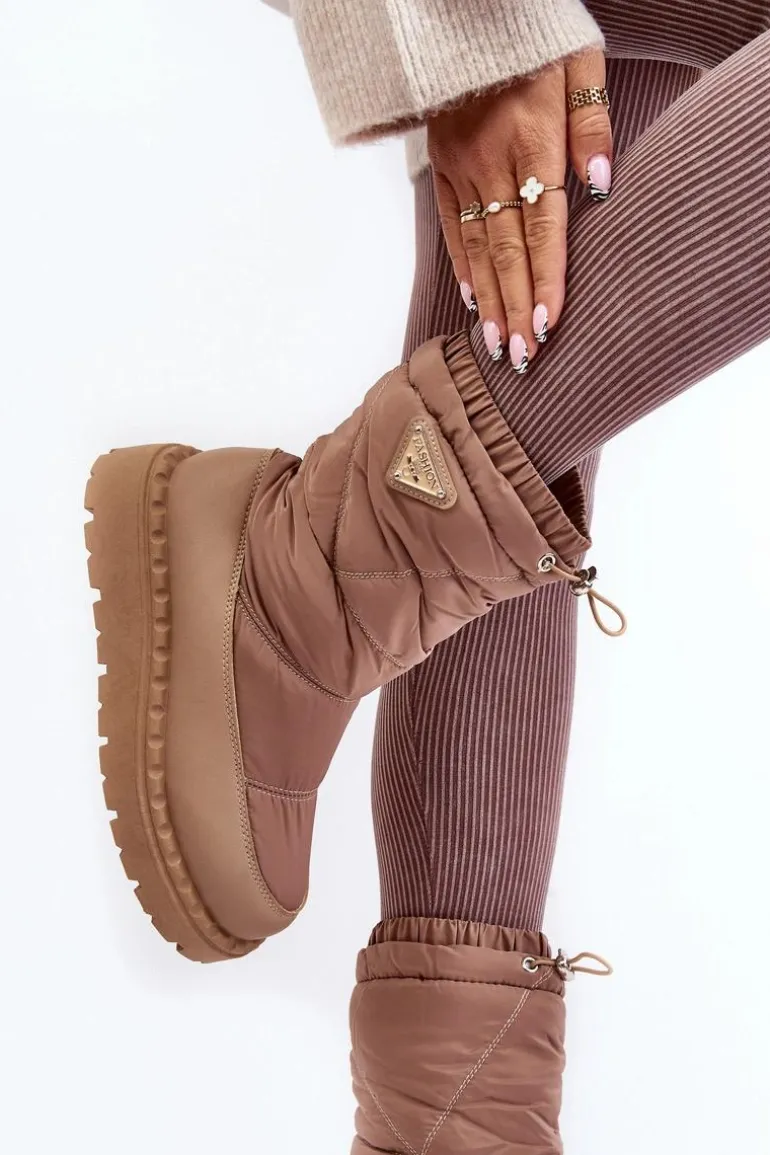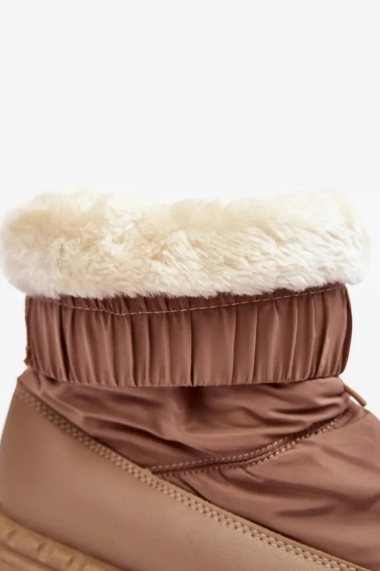 Śniegowce damskie osadzone na grubej podeszwie z gumowego tworzywa. Wykonane z połączenia eko skóry i materiału tekstylnego. Środek ocieplony grubym futerkiem. Na górze cholewki ściągacz. Idealne na mroźne dni! Koniecznie powinnaś je mieć! Przy wyborze rozmiaru prosimy sugerować się tabelą rozmiarów.